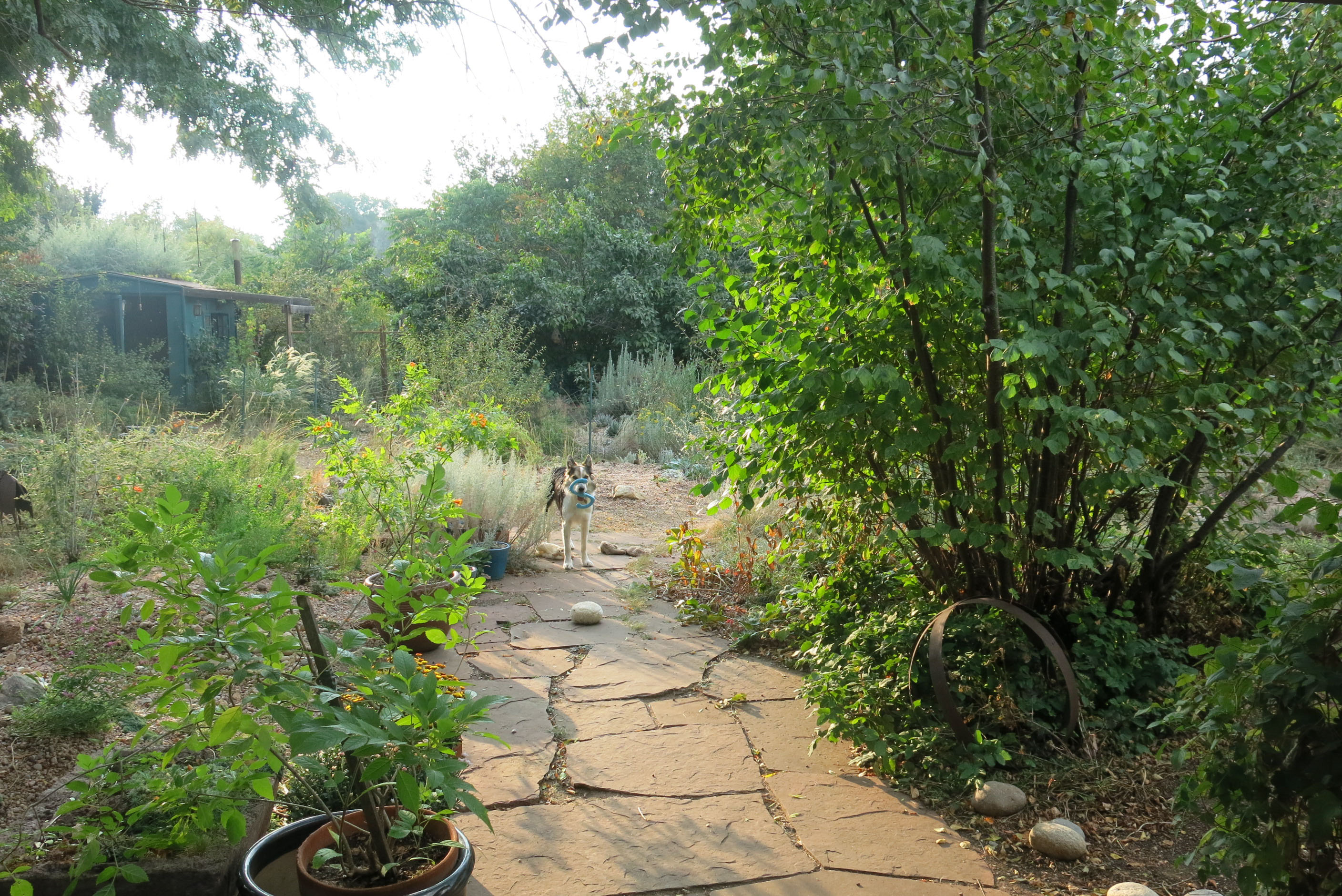 That new toy…is that “s” for super? Does it squeak? That salvia is a beautiful blue. Is it that turquoise in real life? We pretty much don’t fertilize anything anymore. We kind of just chop everything up and put it back so I hope things even out that way and the soil stays fertile. It seems like everything we do to make things “better” just ends up interfering. When we lived in the woods you could turn over some leaves and see the strands of micorrhizae everywhere but not here. So, what about Earl? Does he stay well away from the house now? You keep saying how dry the garden is but it doesn’t look dry at all. It looks very lush.