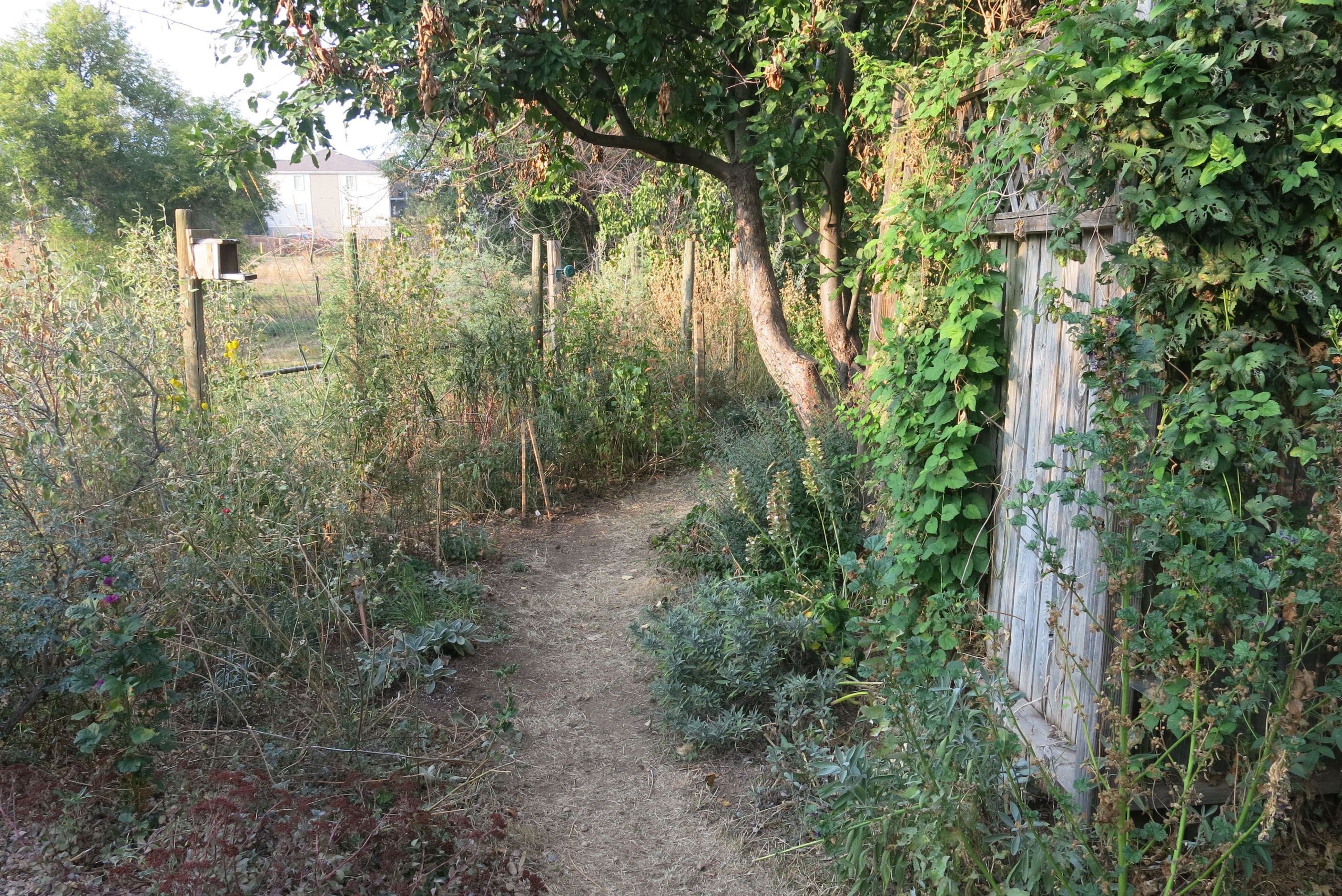 If you walked past me and then turned around, this is what you would see. I’m not in this picture, if you couldn’t tell. That was a grass path this spring. It isn’t now. That box was a squirrel feeder but the guy I live with said the squirrels were so stupid they chewed the box to pieces instead of just lifting up the lid. One squirrel figured out the lid business, but others wrecked the whole thing.