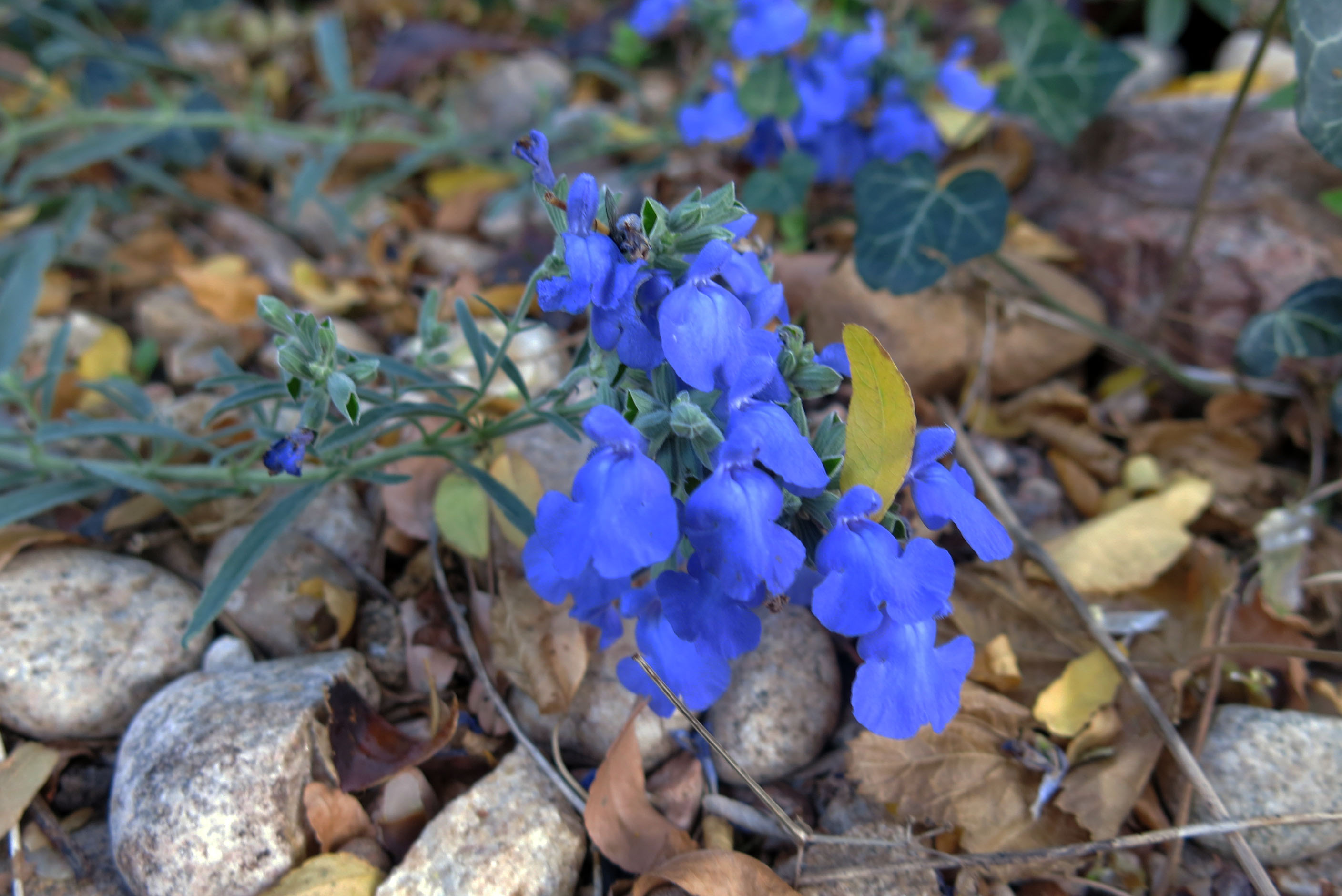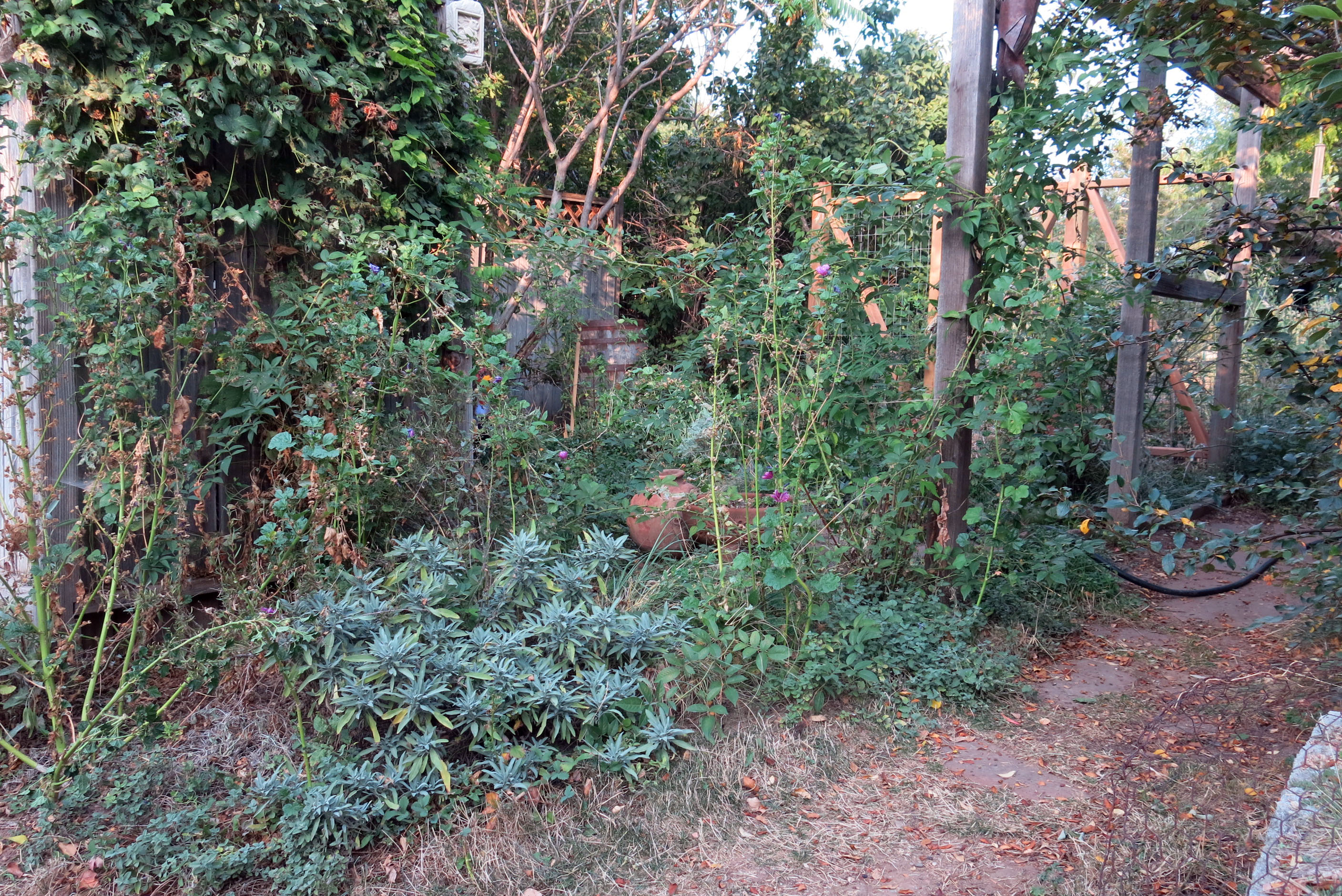 No, the new toy is this fancy rubber-type thing that is supposedly chew proof. Chew resistant. I’m not sure I know anything about Earl. The guy I live with just said that was the name of a squirrel. No, most of the squirrels here are so totally terrorized, by yours truly, that none dare light on the ground. The garden really is super dry, but the autumn light makes it look less dry. Some watering has been going on, but not a lot. I can see blue, and the salvia is actually a darker blue than the camera made it out to be. But it flowers on the ground.