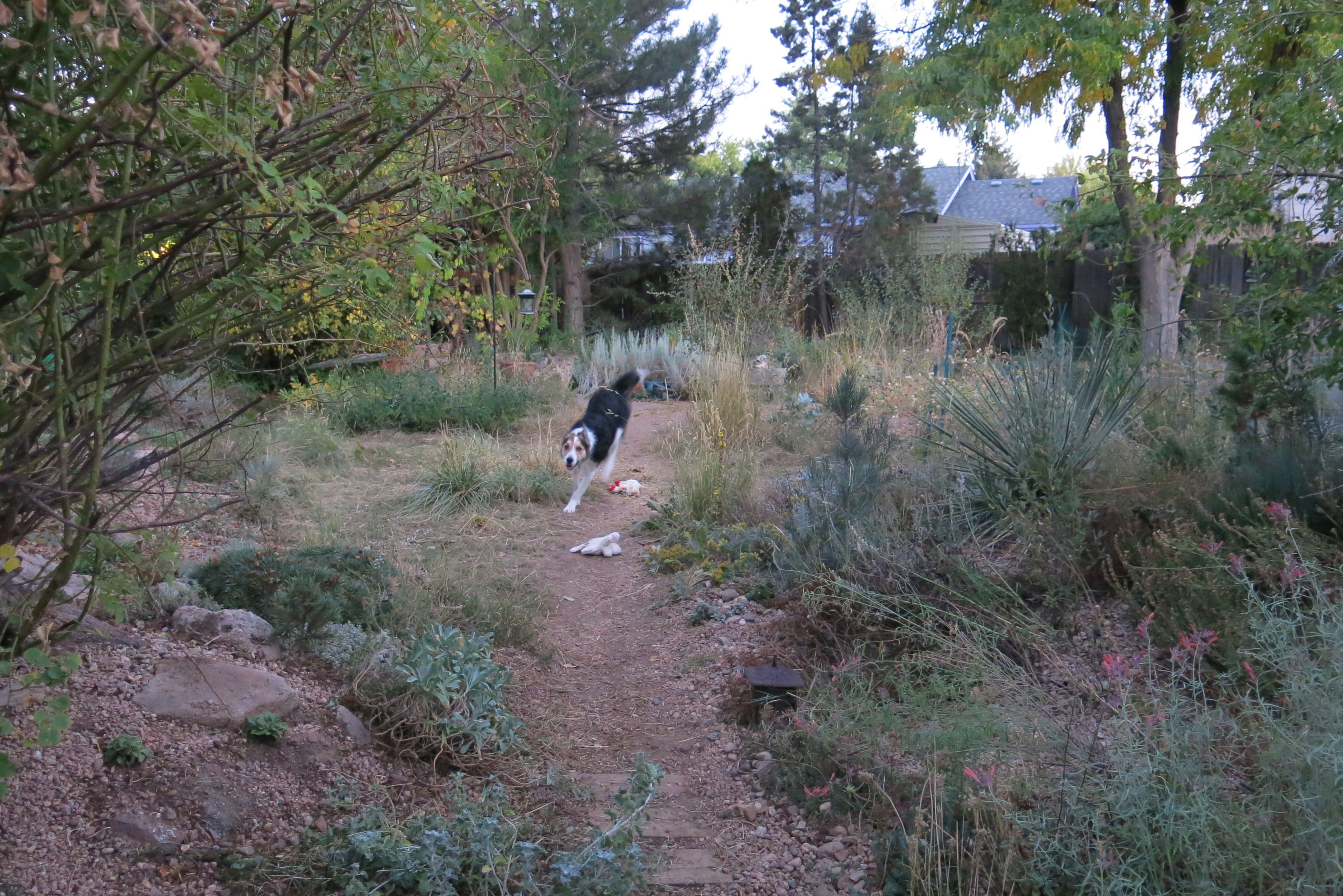 Not only was there a big crisis about the hair cut, but there was also an enormously huge horticultural crisis which originated with the plantings in the central bed, that is, the one right in the middle of what passes for a lawn here. The guy I live with fretted about this a lot, and hemmed and hawed, and thought and thought, and eventually removed most of the plants in the central bed and replanted them with native grasses. So that’s what happened. Sideoats grama, mostly. There’s still plenty of room for me to race around, which I appreciate. You can see where I walked, in the lower left there.