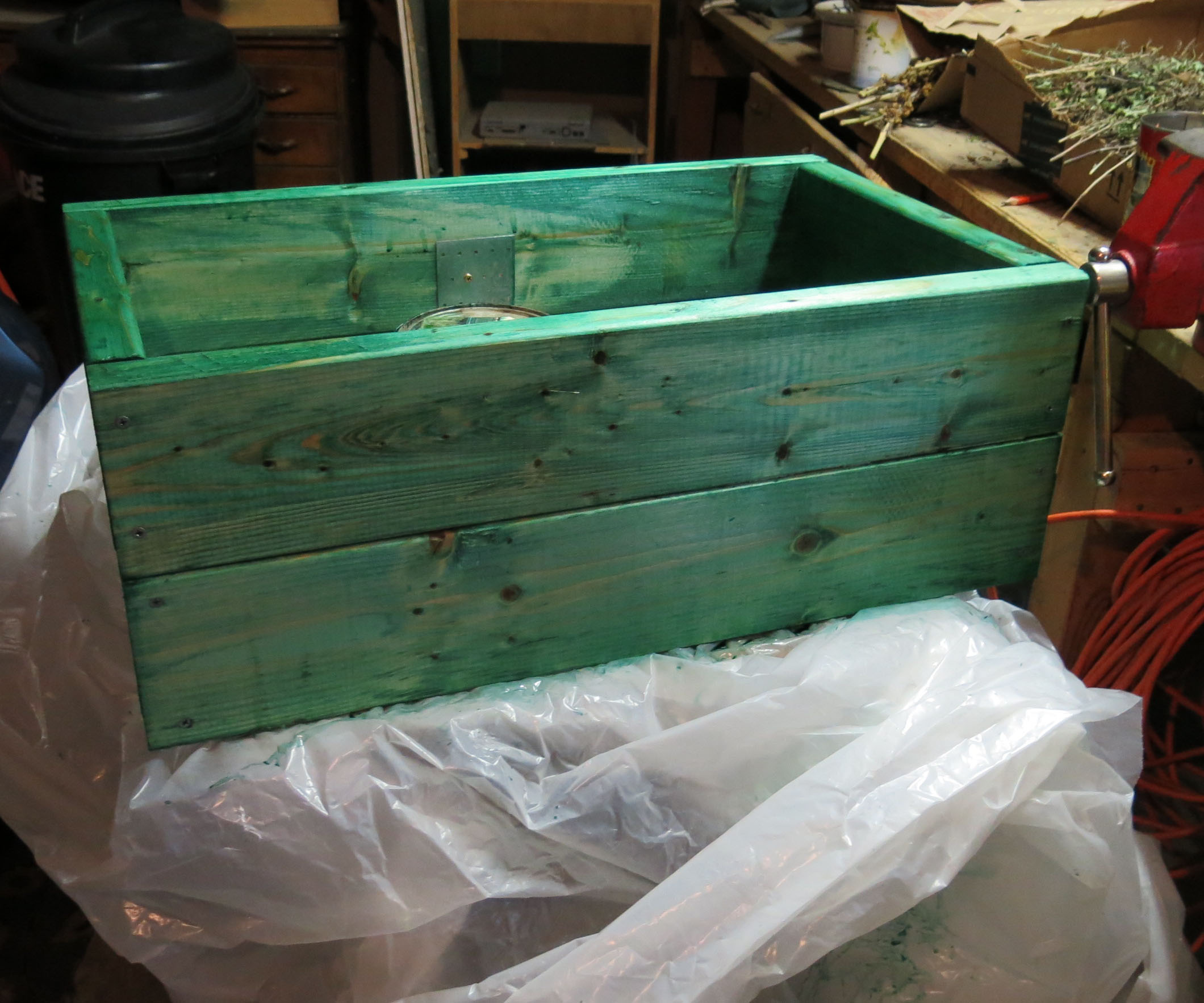 Then the guy I live with decided to paint the one box made out of pine, with Cuprinol, to keep it from whatever Cuprinol keeps it from, since it never is wet enough here for wood to warp or rot. The stuff isn’t toxic to plants, and can be painted, if desired. Otherwise the green more or less ages away, he said.
