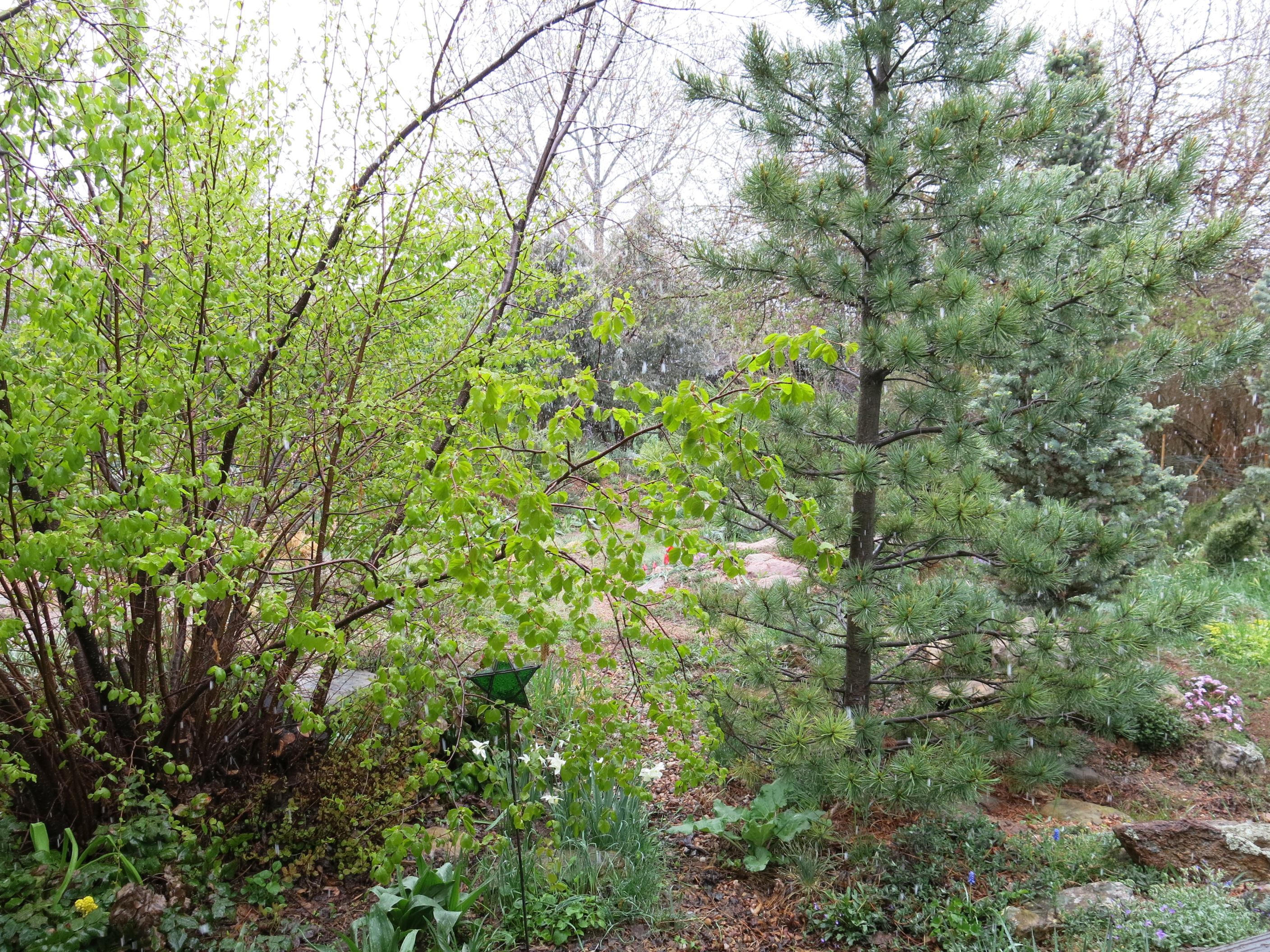 The birch there, on the left, lost a couple of branches in the first, or second blizzard. He’s unhappy because a number of conifers were badly disfigured and he might just take them out. The tree on the right is a pine, but we don’t know which kind. It wasn’t what he thought he was planting, which was Pinus pumila, the dwarf Siberian pine. That isn’t what this is.
