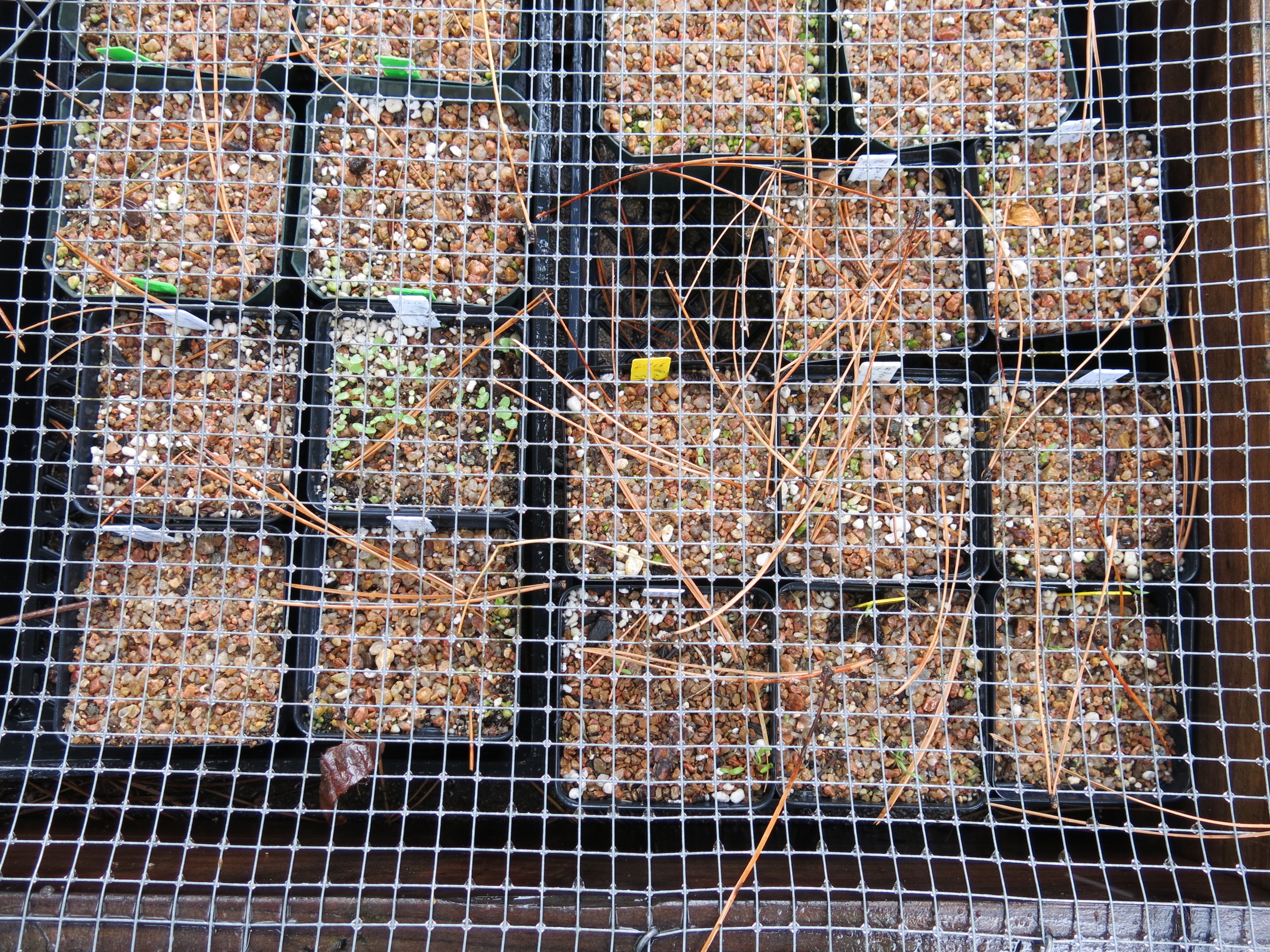 As you may remember, I live in ABQ, with freeze-drying wind, harsh light, etc. (fence blew down yesterday). I planned to harden the seedlings off in their flats, maybe stating mid-May, so I guess in the late summer/ early fall I can move them to small containers for the winter. I had excellent germination in a coir/pearlite mix, and have been giving them diluted African violet food. If we have a long fall, maybe they could be planted out-but I don’t want to crush them. I really just need some verification for my plans. The hardware cloth looks like a good idea for outside protection from stomping feet. Thank you. Southwest gardening is interesting, to be sure.
