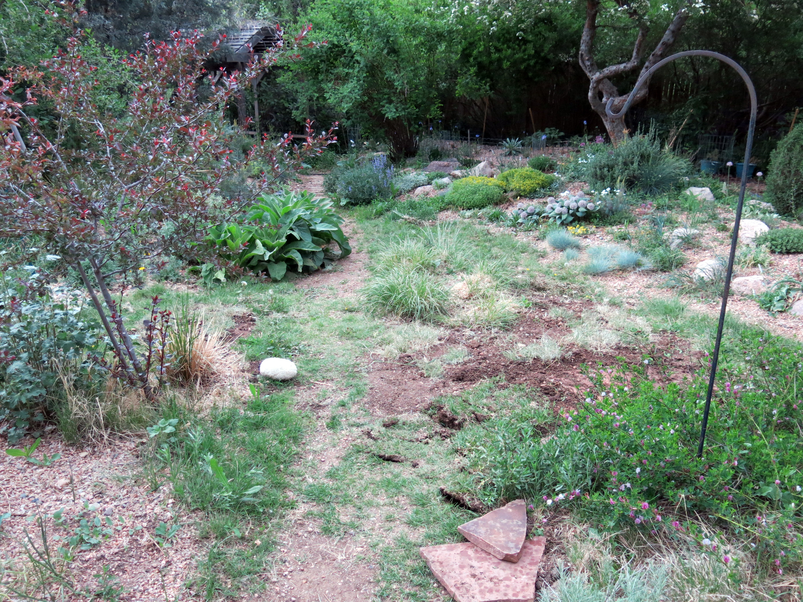 There’s also some peculiar work going on here, which must have a point. You may be able to see some of the buffalograss which was moved from the “way back”. The regular grass, which came back even though it wasn’t supposed to, is being dug out. That much I know. The white thing there is one of my stuffed toys, and it’s still stuffed, and still squeaks.