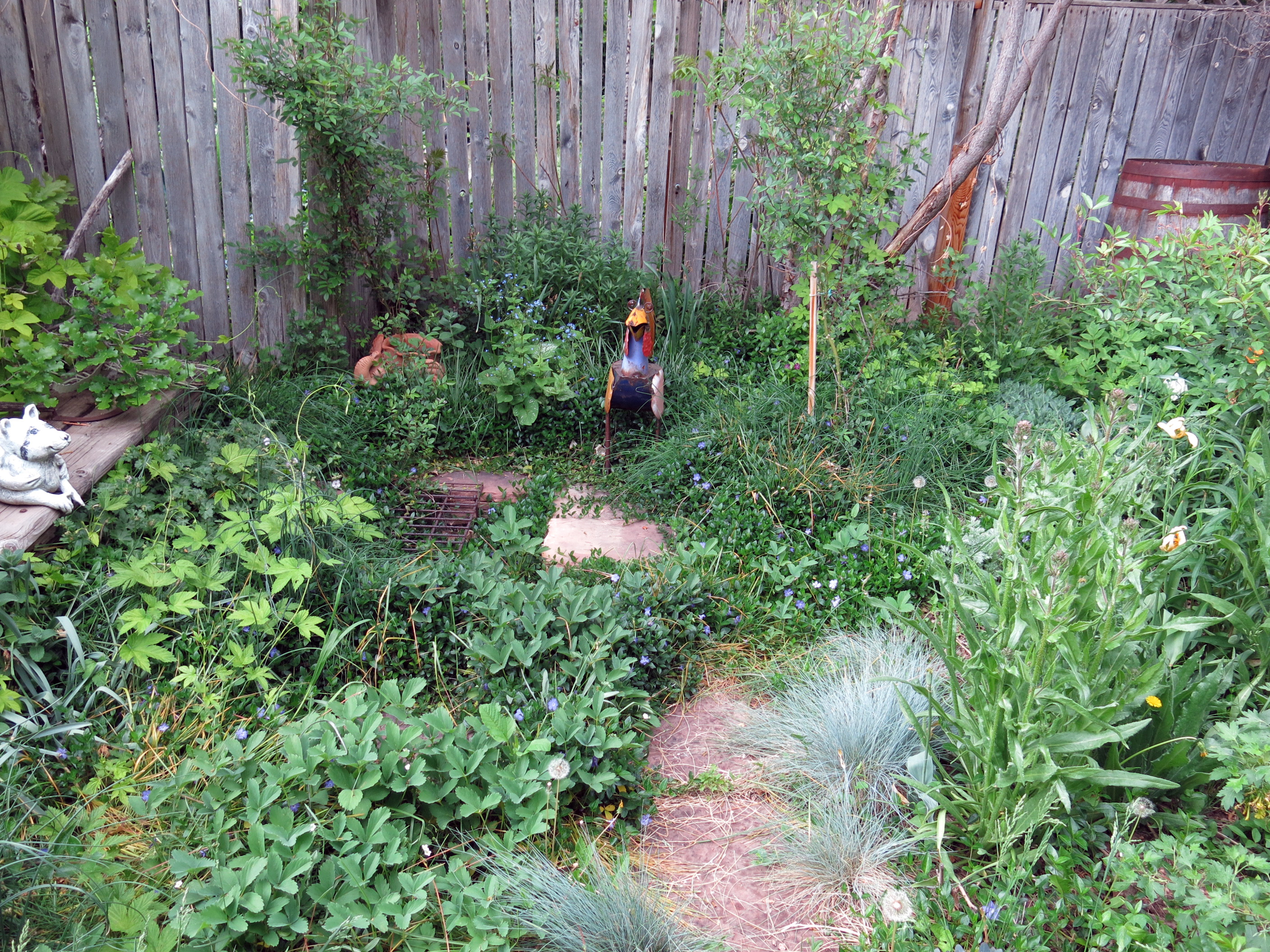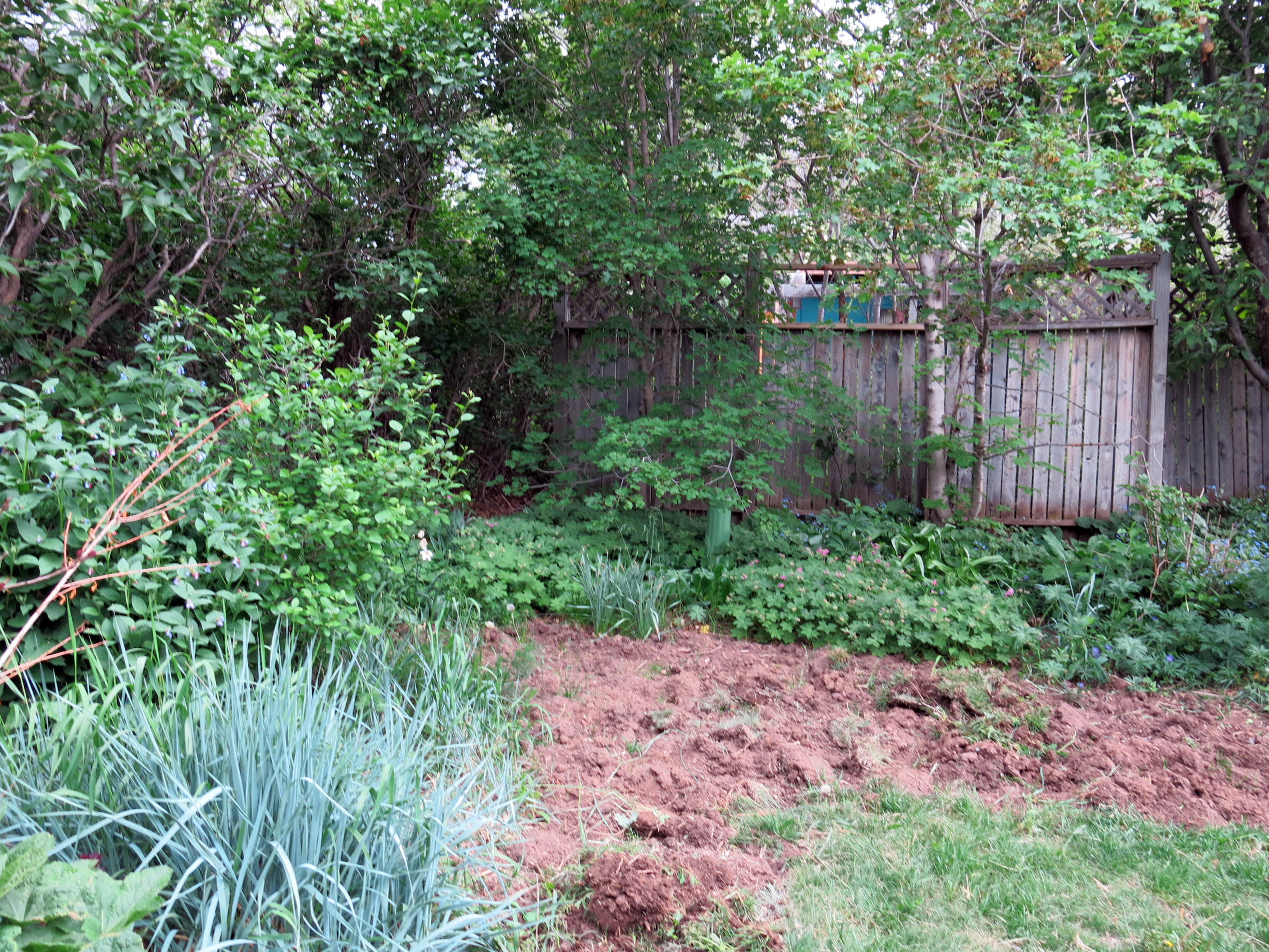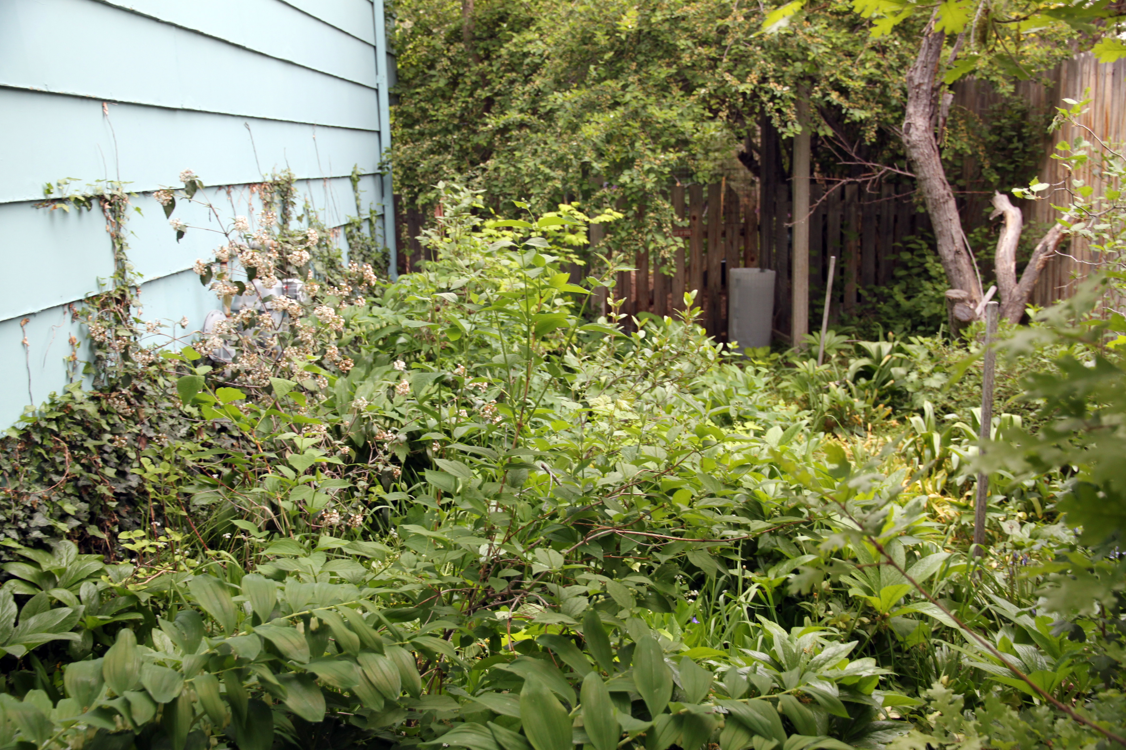 The side yard, or really, the shade garden, is “a hopeless jungle”. There are, surprisingly, not very many weeds here. The tree you see on the right there is dead. The guy I live with says it was struck by lightning years ago.