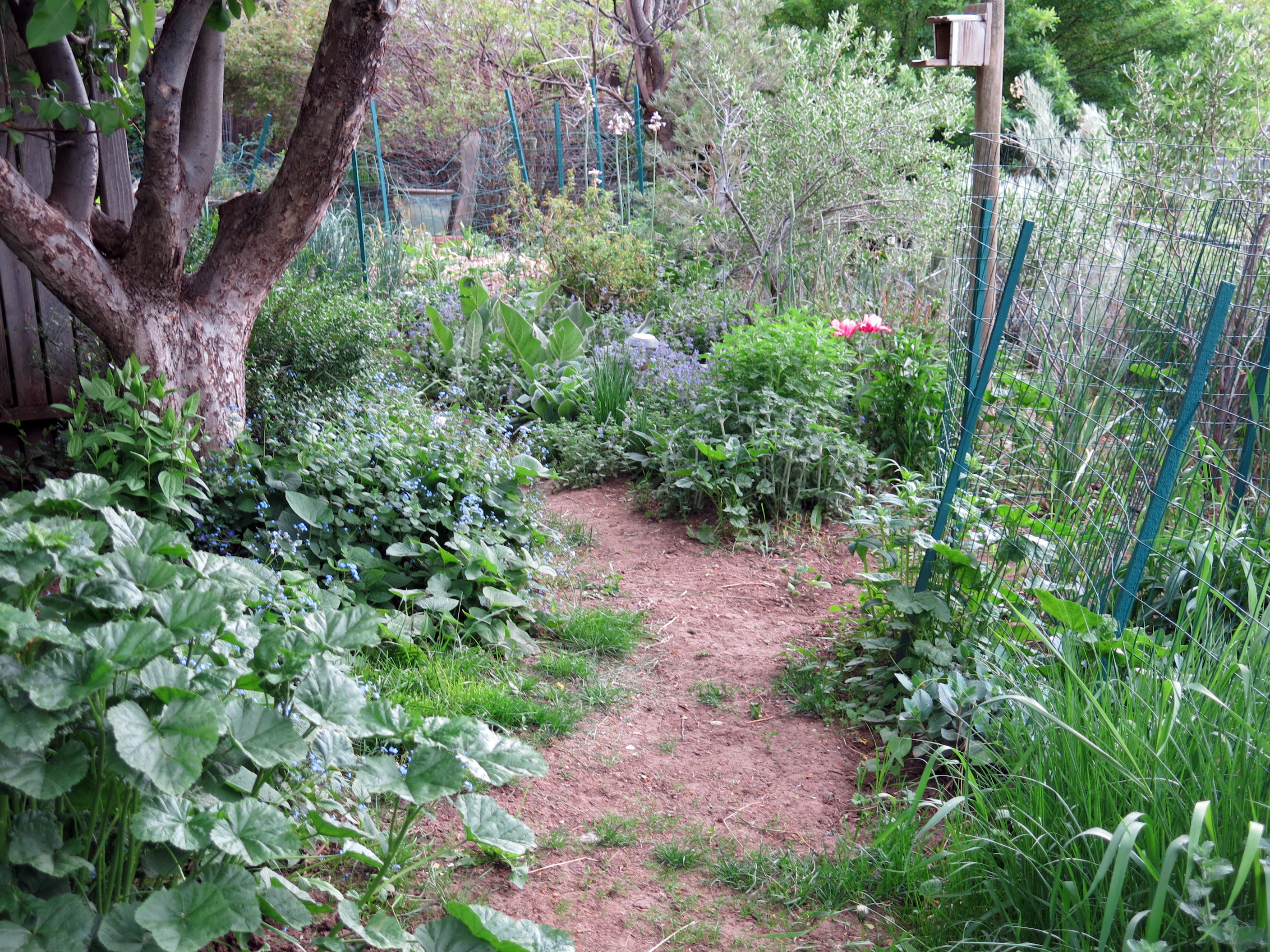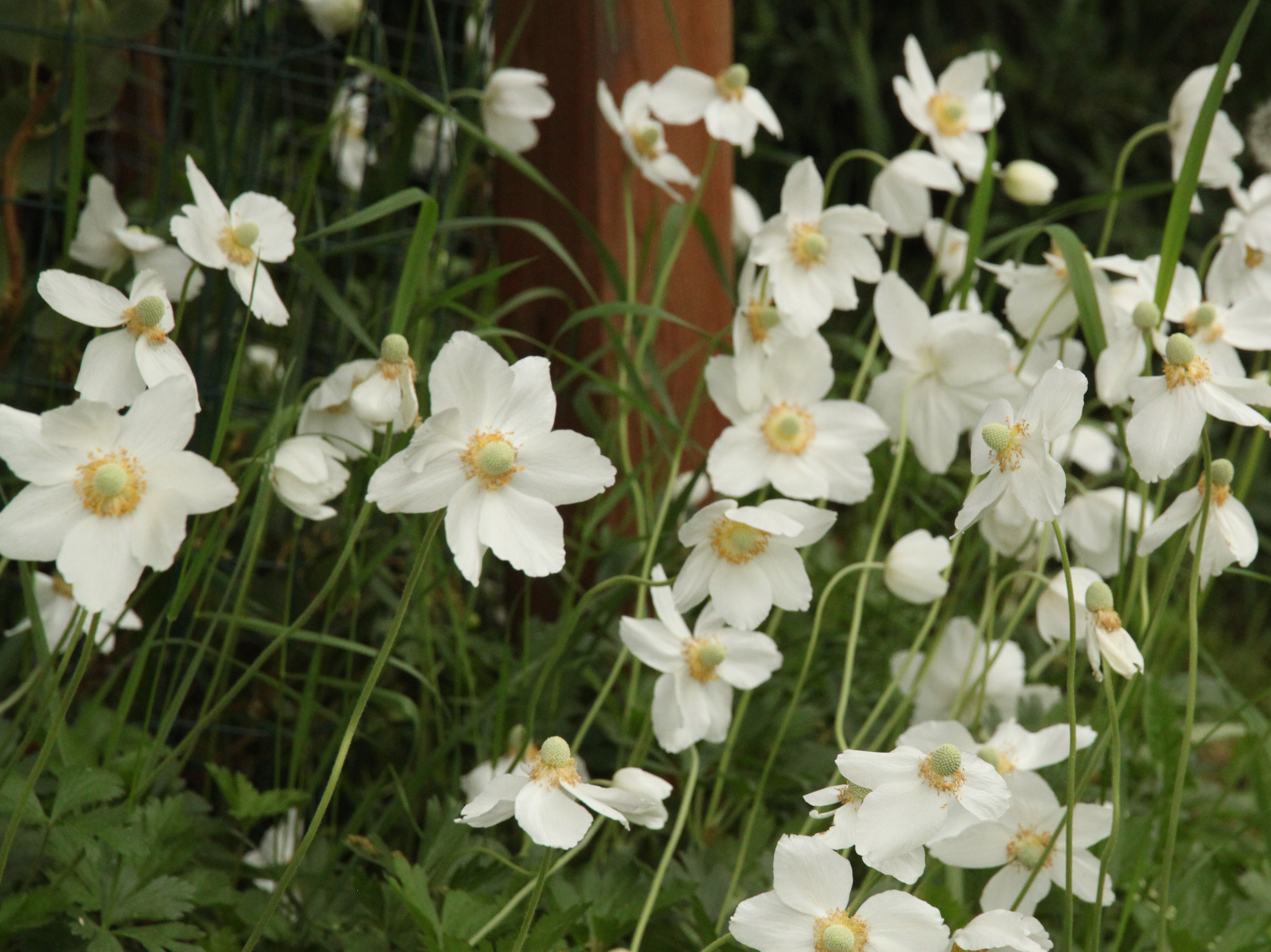 The grass (smooth brome, the “awfullest plant on the planet”) has even gotten into the front yard. It’s the grass in the field, and surges against the back fence, trying to get in, which it does, fairly successfully. You can see it here, in front, growing in the Anemone sylvestris. The anemone is really a “side-yard plant” but often sneaks into the front yard, under the shade of the big Arizona cypress.