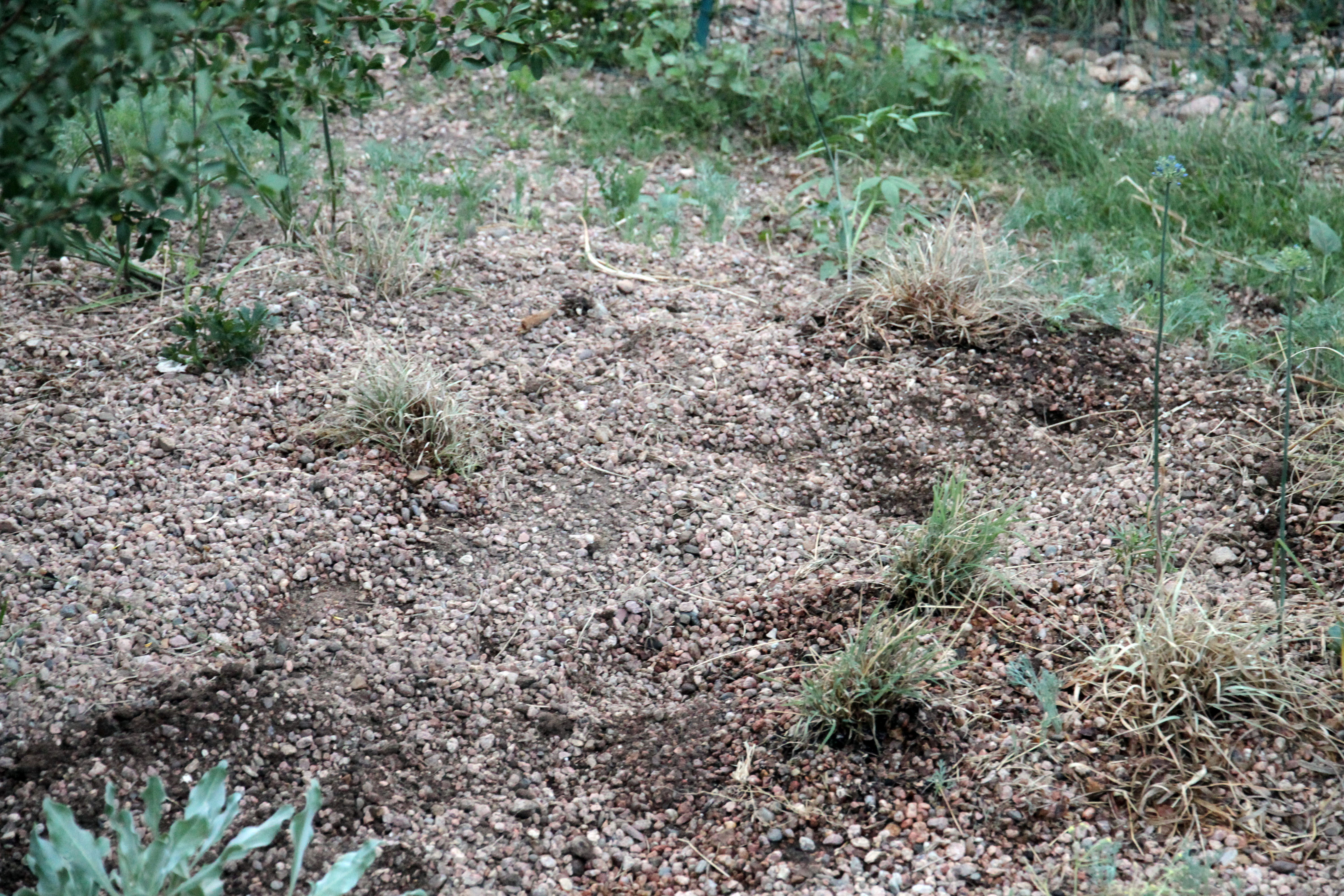 Both of us began to worry. The “eminence” is made of sandy loam and pea gravel, as maybe you could tell, and when plants are planted there, they root into the loam very quickly, so the grasses would have been difficult to pull out. Who would do this? The guy I live with’s friend came over today and she looked at the place where the missing grasses were, too. She said they were missing. So all three of us agreed on that.
