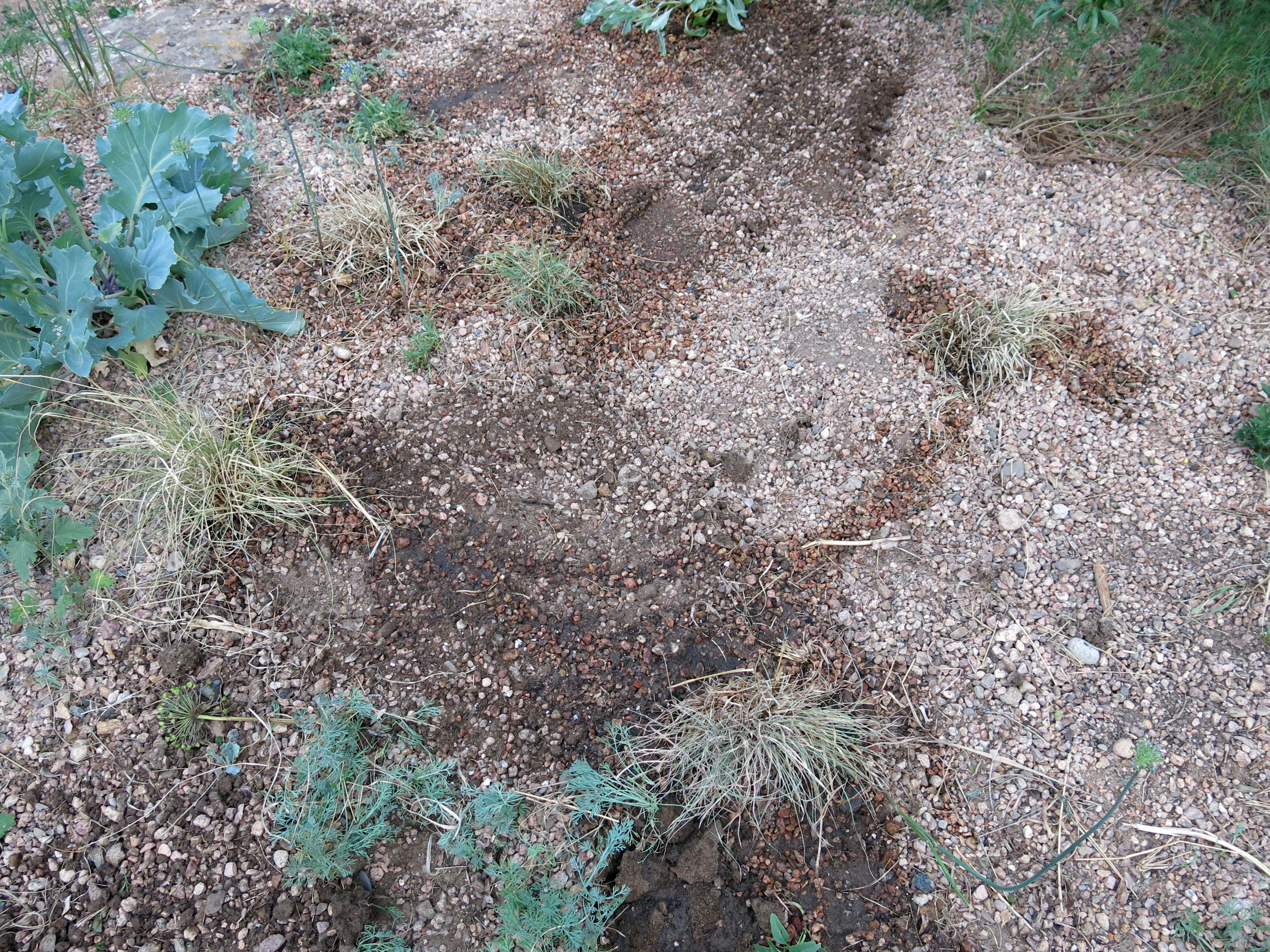 It was not I who removed the sideoats grama. The guy I live with now believes it to be the work of the Colorado Giant Invisible Gopher. (Gigantogopherus invisibilius var. coloradensis.) “A rarely-seen occasional pest of gardens”, he says. I agree; I am pretty cute. It’s 89F (32C), with a “stiflingly muggy” nineteen percent humidity right now, so I got to get all soaking with the hose. That was nice.