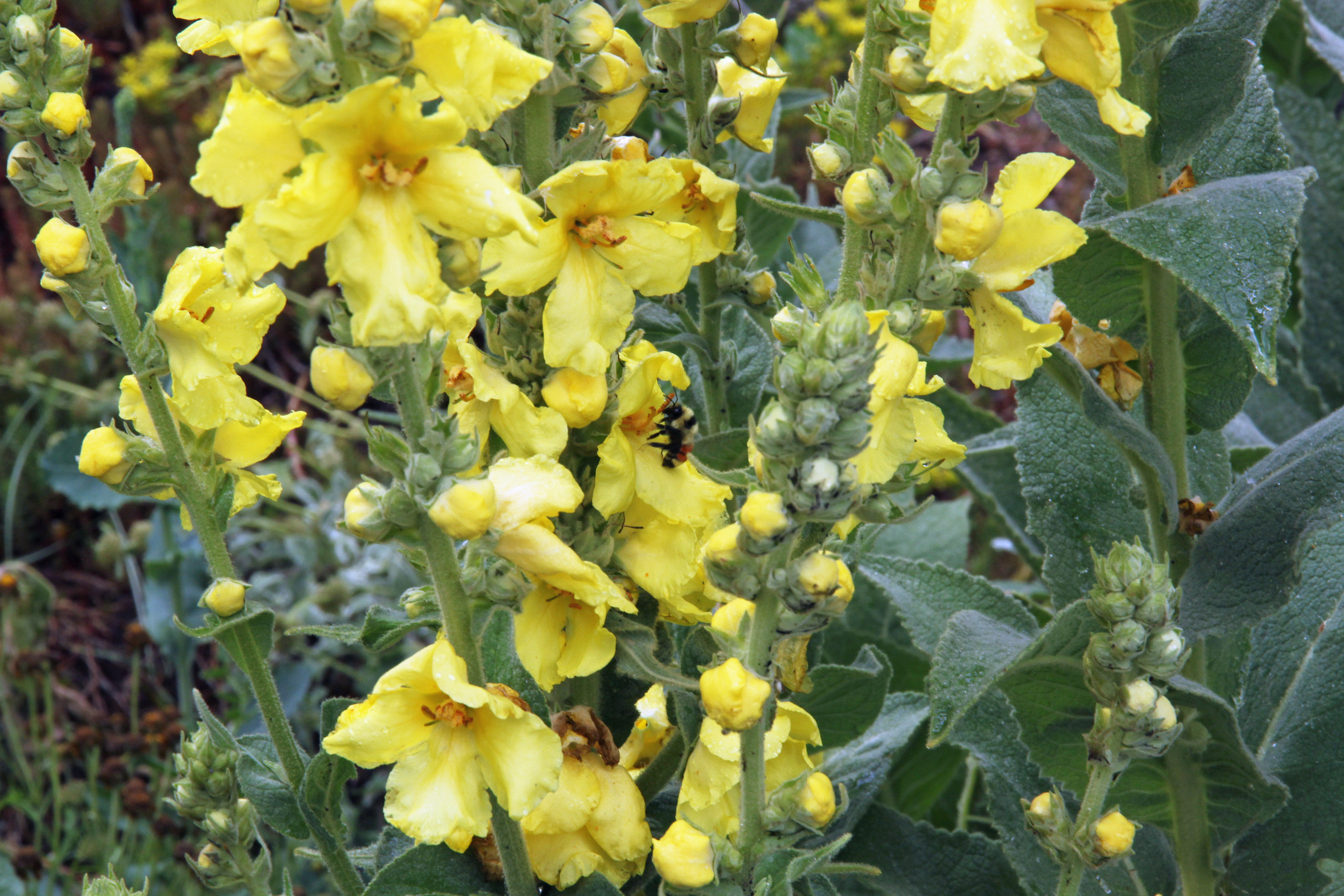There are bumblebees everywhere, too. The guy I live with keeps telling me not to try to catch them, but I don’t see why not. He says something about stinging, and also says he knows best. We think this is Verbascum densiflorum crossed with V. olympicum, but we’re not really sure.