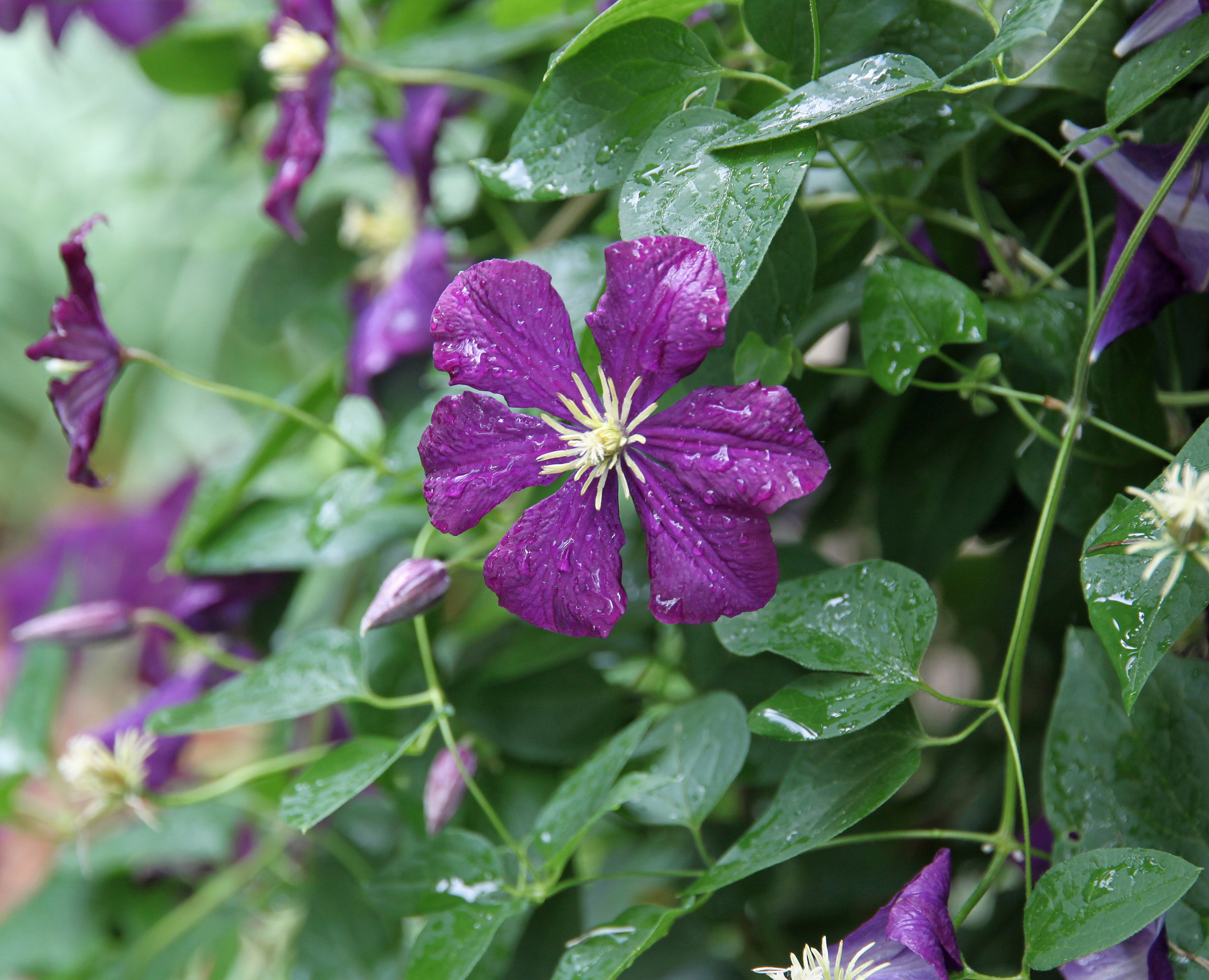 The clematis are blooming. There aren’t many here these days. I guess there used to be, back in the old days. I think this is ‘Etoile Violette’.