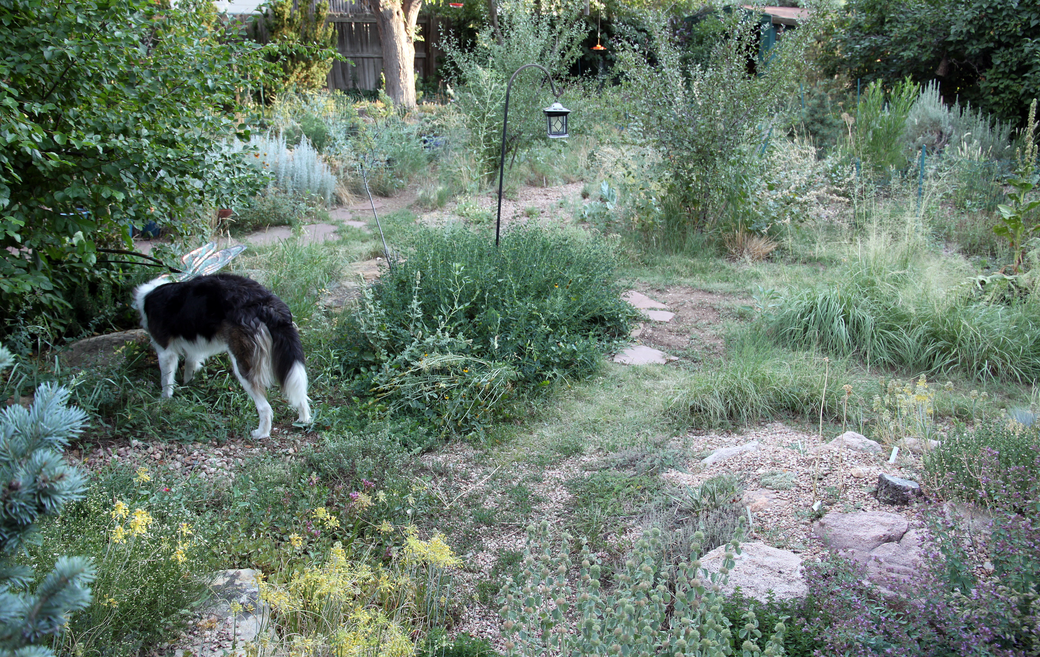 You see that spot under the solar lantern, there? With the little pieces of flagstone? That’s where the buffalo grass didn’t take, and so the pieces of flagstone were put there because, well, I don’t know the reason why. Maybe the guy I live with didn’t want to buy any buffalo grass seed this year.