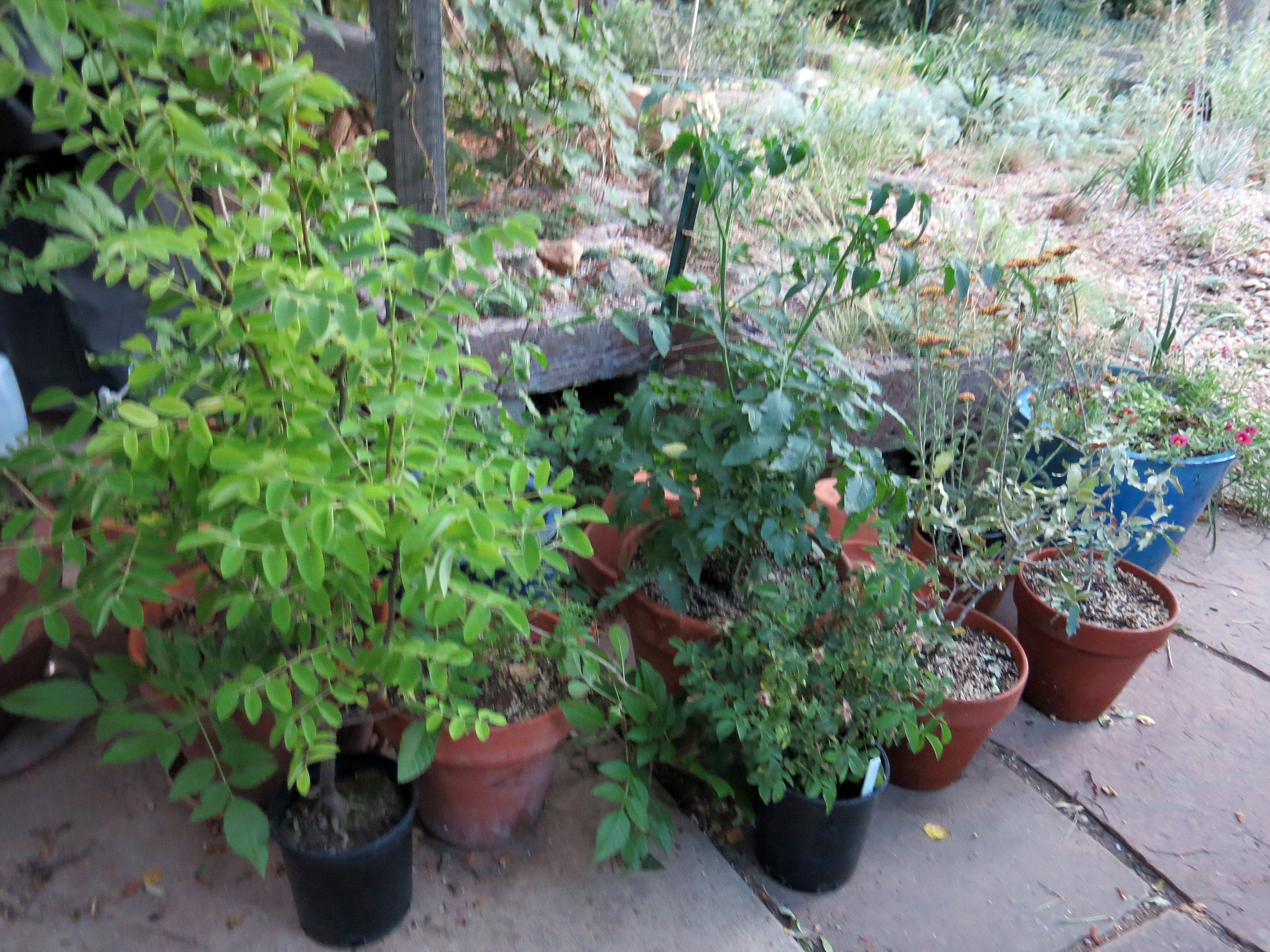 There were two little oaks here that did fry, almost completely. They’re in the two pots on the right. They were purchased last year and made it through the winter, but the guy I live with says there weren’t enough roots to fully hydrate the leaves when the weather began to get roasting. And so only the lower leaves, closest to the roots, are still green, but the rest are crispy and sad. The oaks went into pots to get watered more.