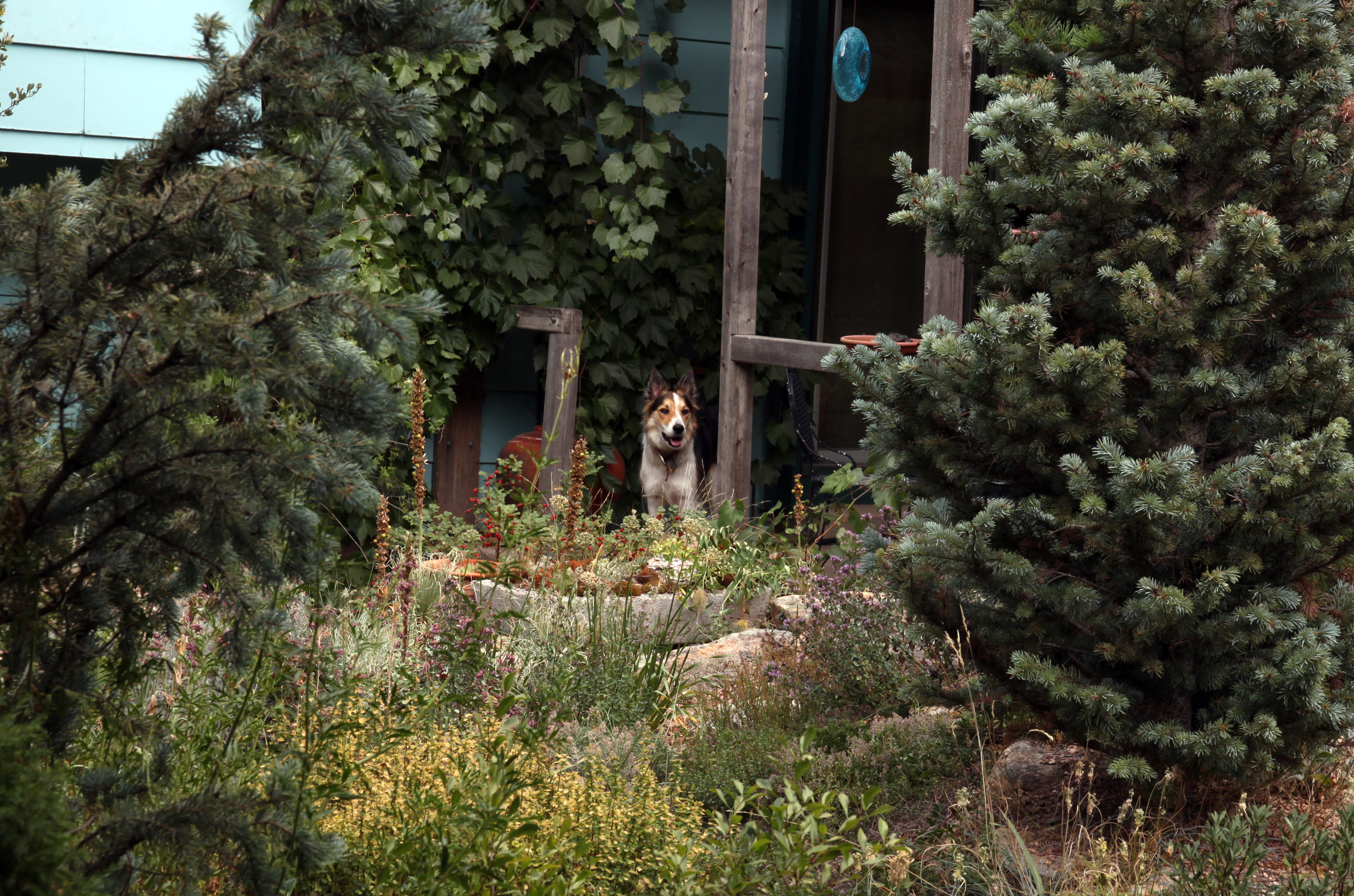 It poured rain for almost an hour in Idaho Springs after work yesterday. We had much thunder and lightning, too. Clear Creek is very wet this morning. Don’s grass is still crunchy, though. Two weeks of heat and no rain in July killed the grass in the sunny part of the yard. Tobydog likes to roll in it.