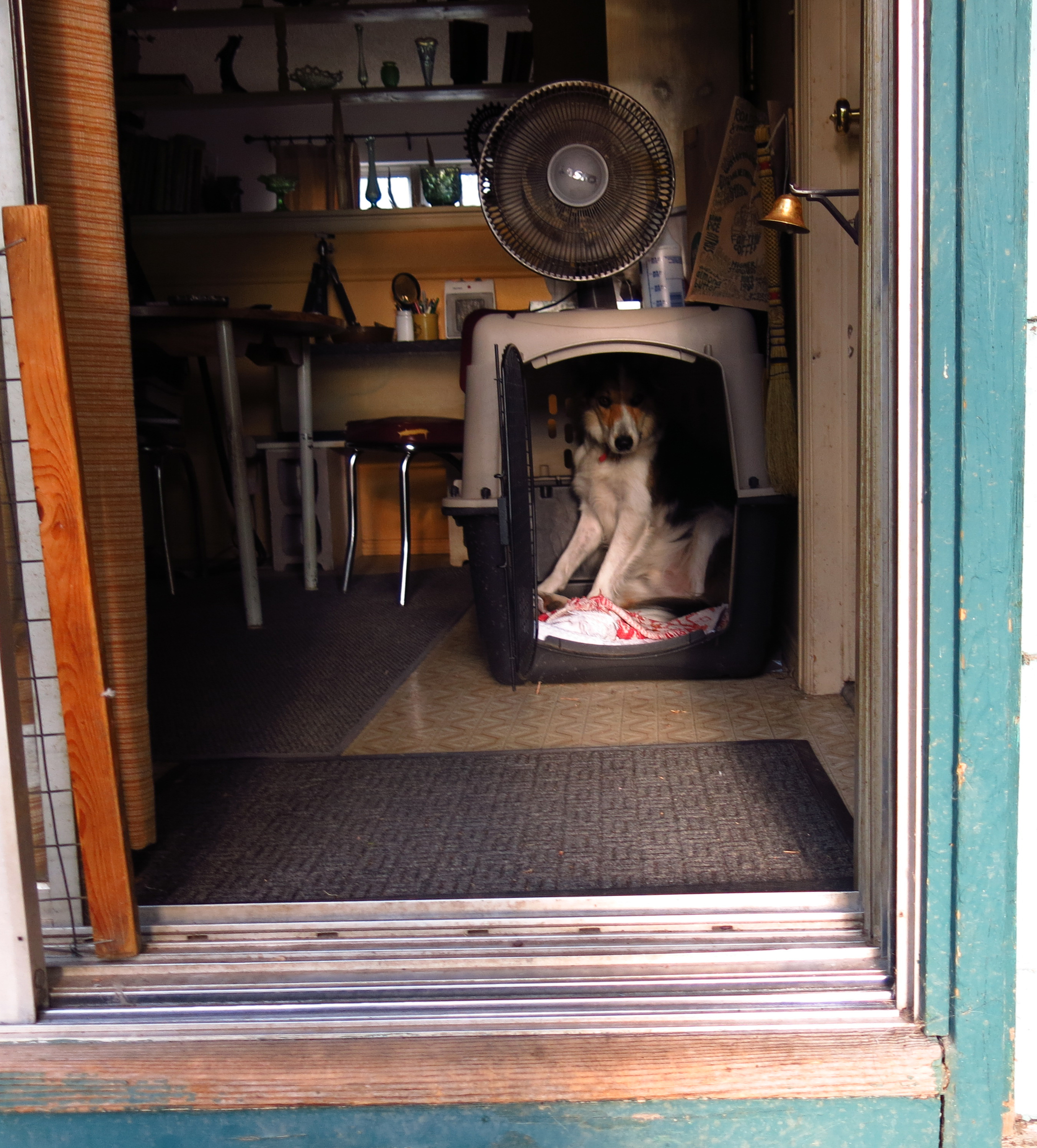 Thanks; yes, it was my first time out, besides going to Day Care. I was hitched in, with my Roadie, so the windows could be down in back and I could look out, and stick my nose out into the chilly high-mountain air. The guy I live with was pretty disappointed when I became afraid of thunder. It was because of that super-loud lightning strike, which neighbors say was just north of the canal road, and then the next day, on my evening walk, there were firecrackers, and so that settled it for me. But then he realized that all of the purebred border collies who have lived here have been afraid of thunder, and so there was more of that continuity, you know. Oh, there’s a firecracker right now ….I’d better go.