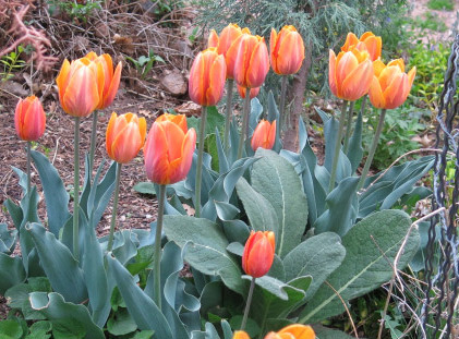 Maybe I should back up a few days and make this post even more fascinating, and to explain the title. The guy I live with went out for a while, a few days ago, to take his mom somewhere, and on the way home he stopped at a nursery (believe it or not), and found a small bag of tulips which were on sale. ‘Prinses Irene’, which he says is one of the best. It was featured on a blog post a few years ago but I thought I’d show it again.