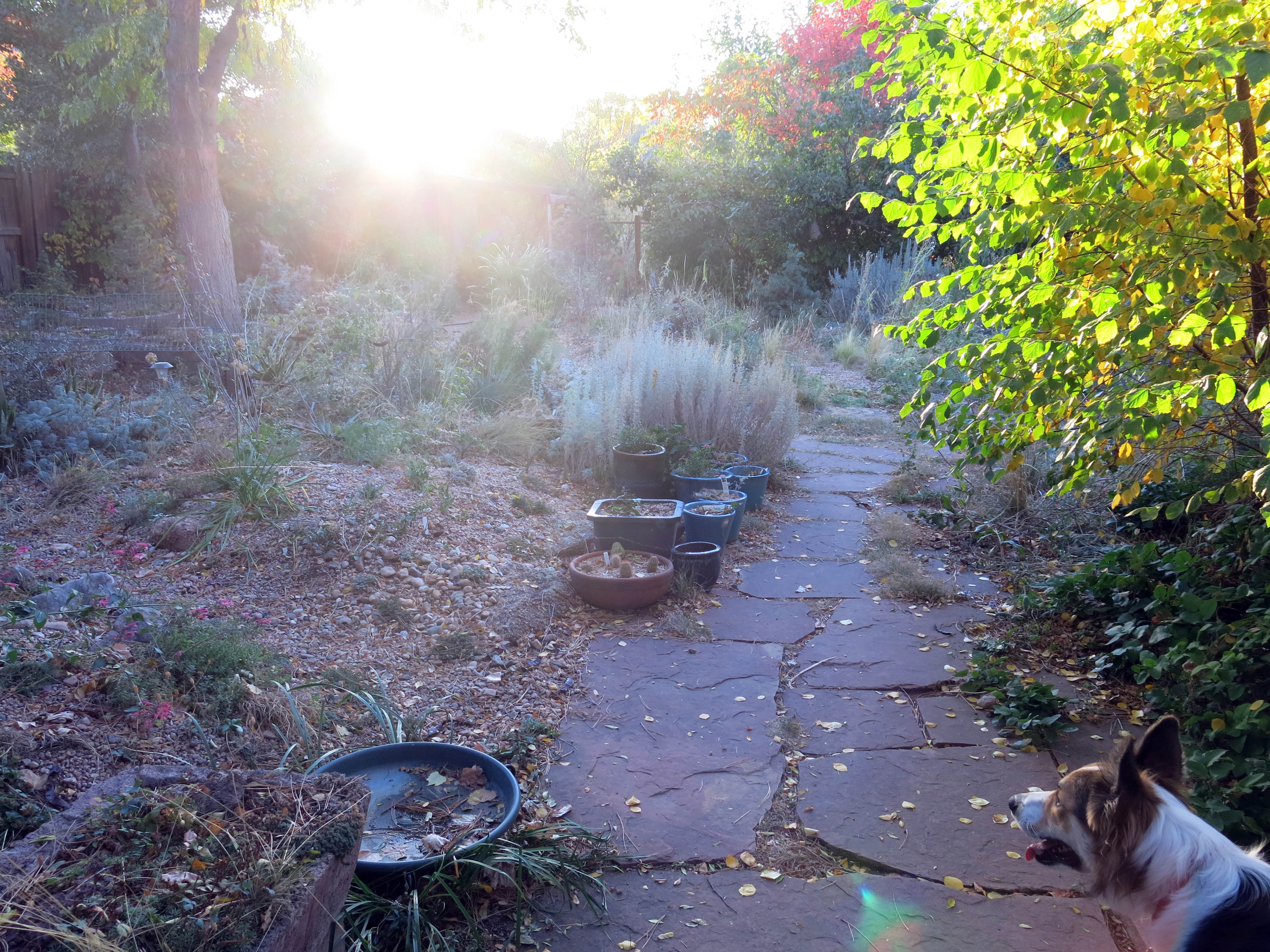 The guy I live with, who, as you may know, knows everything, says that the Great Horned, which is what the owl is, sleeps in the tops of trees during the day. There’s always a tree with crows or blue jays or magpies or even smaller birds yelling at a sleeping owl. Apparently their favorite food is cottontail. Kind of gross and scary, I know. At this time of year there’s always this “Why didn’t I get….” bu;bs, more asters, things like that. And then, come spring, all that is forgotten. We might have gotten five inches of rain (including snow) since the first of the year. It’s really dry here (it’s dry anyway, but this is exceptional). The forecast this morning was for some snow later in the week, which would be okay, but now, just a “chance of showers”. Right now it’s seventy-seven degrees (twenty-five C), thirteen percent humidity, and breezy.