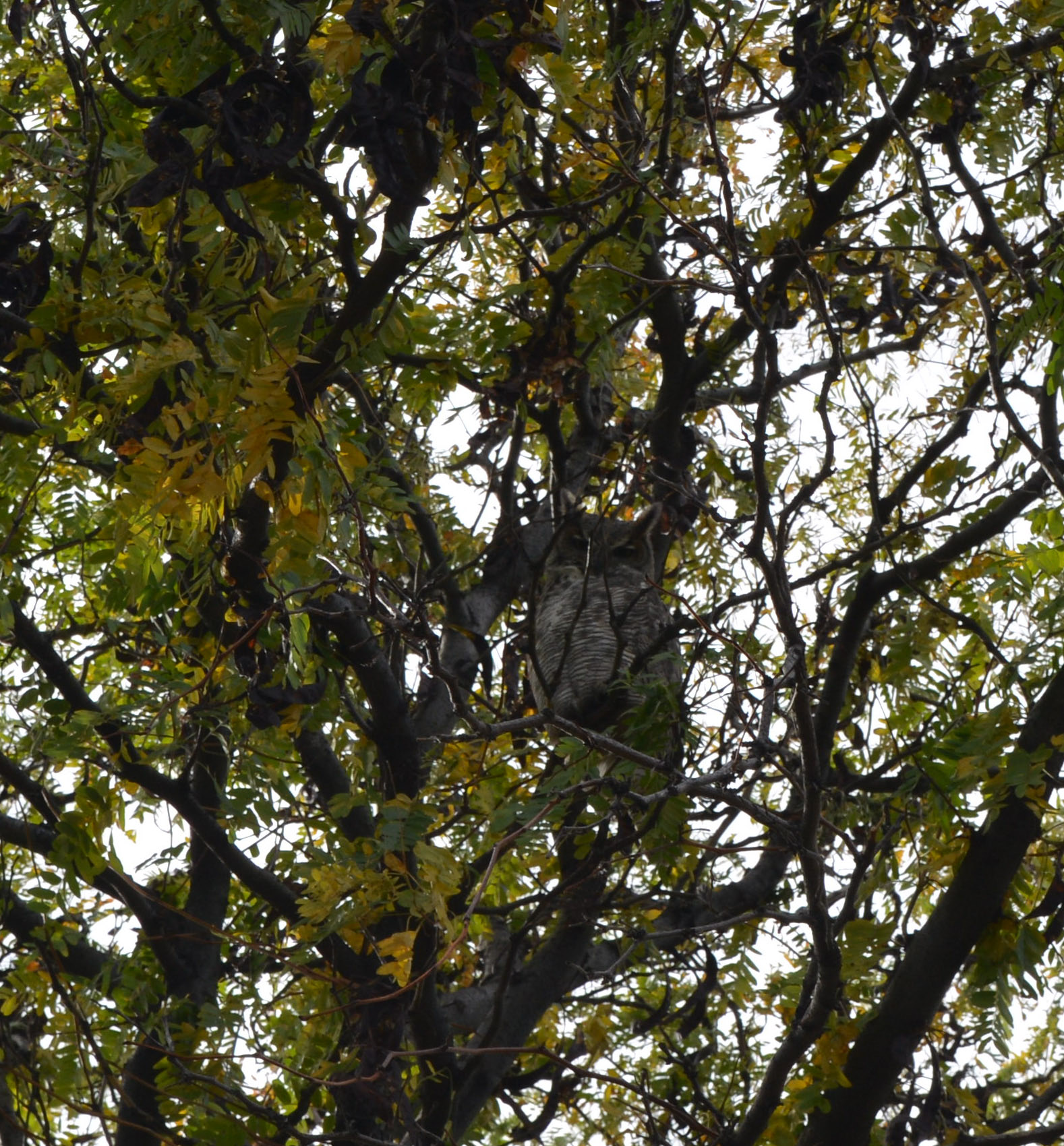 Well, the first thing that happened today, and it was a pretty big deal since almost nothing has been happening here lately (well, nothing hyper-interesting), is that this morning we had a large visitor perch in the honey locust tree. That was very interesting.