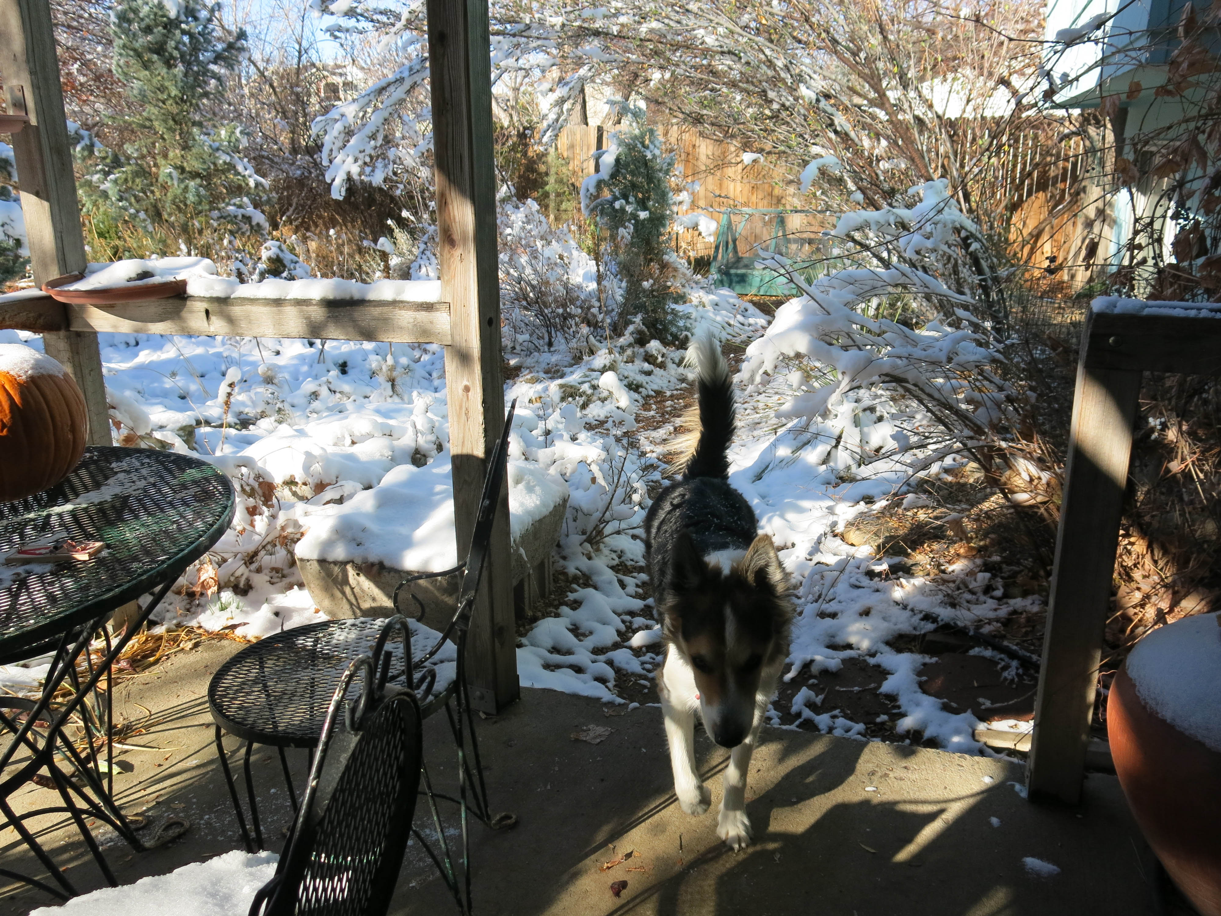 I see already a cleared trail exists to the sunny spot by the newly-built box. Yay for snow elves! I love the pumpkin with snow atop, very seasonal. I hope there is a warm spot inside for you too, dear dog. You are so lucky to have snow. I’m sure you are ecstatic, which is why you were moving so fast for your portrait. Ecstatic usually brings on fast, I’ve noticed.