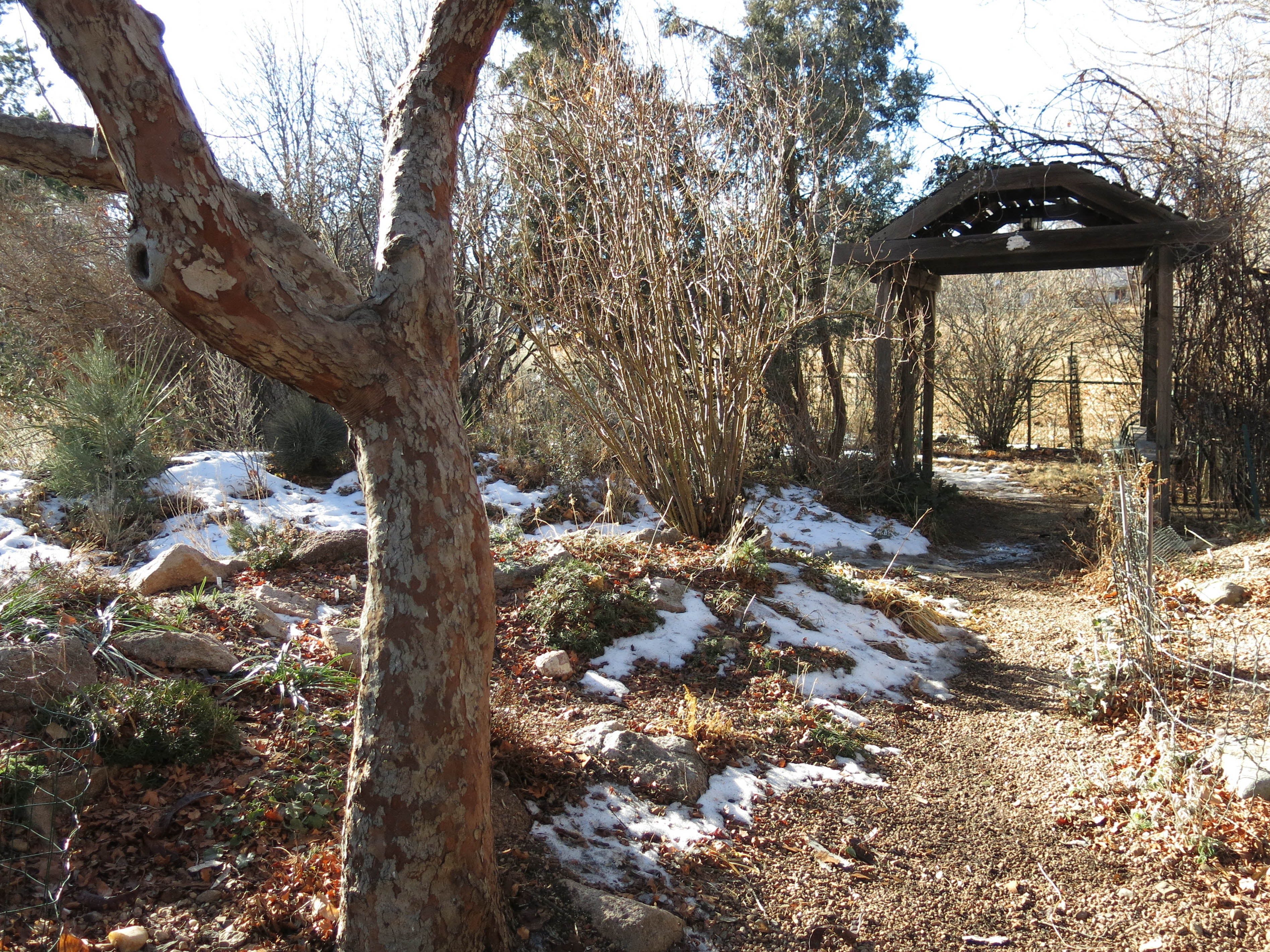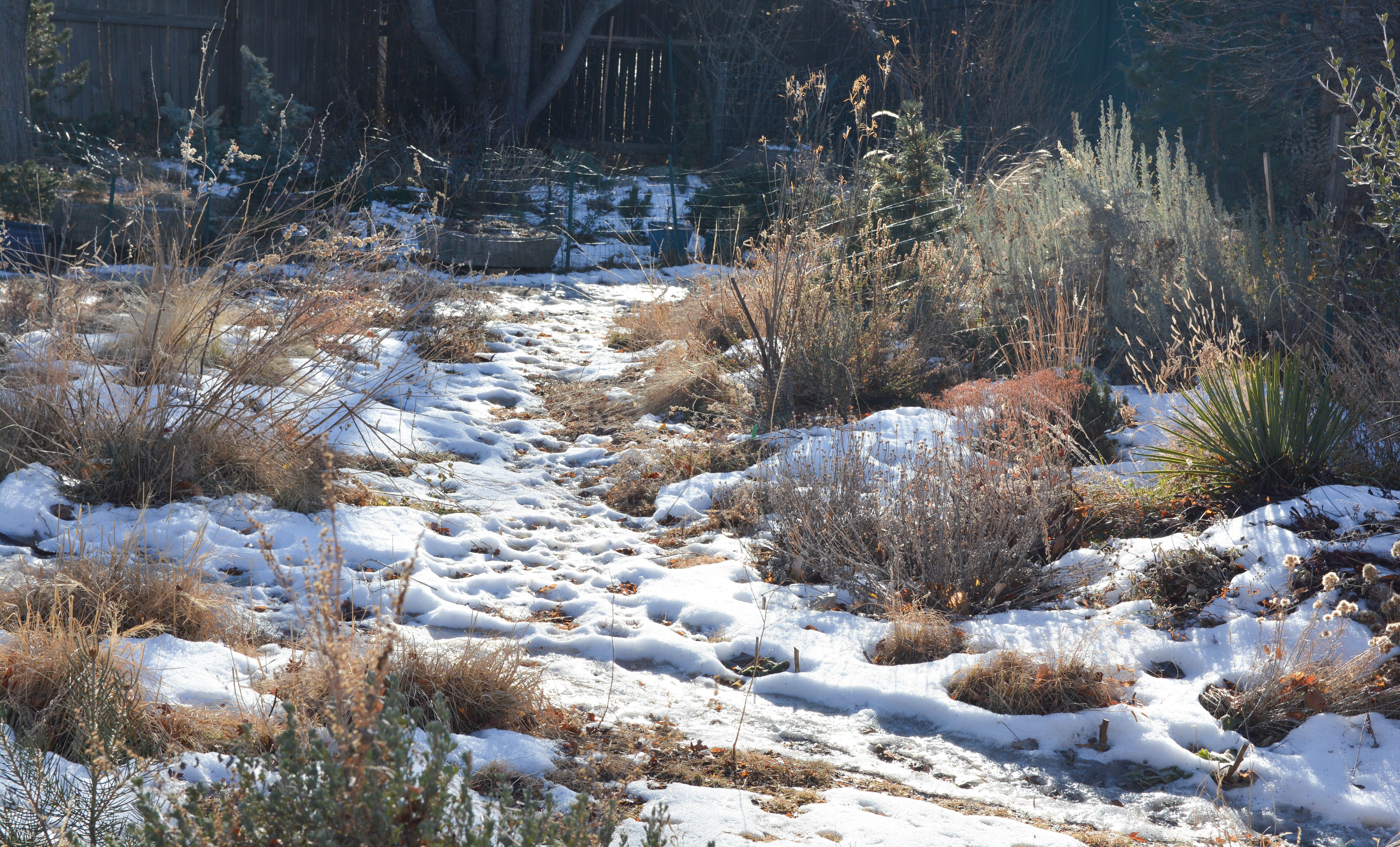 The old-time steel garden fence you see at right, in the picture below, is to keep me from romping in the sand pile. The guy I live with says there are “fancy plants” growing there. Most of the cages you see here and there are to keep rabbits from eating crocus leaves.