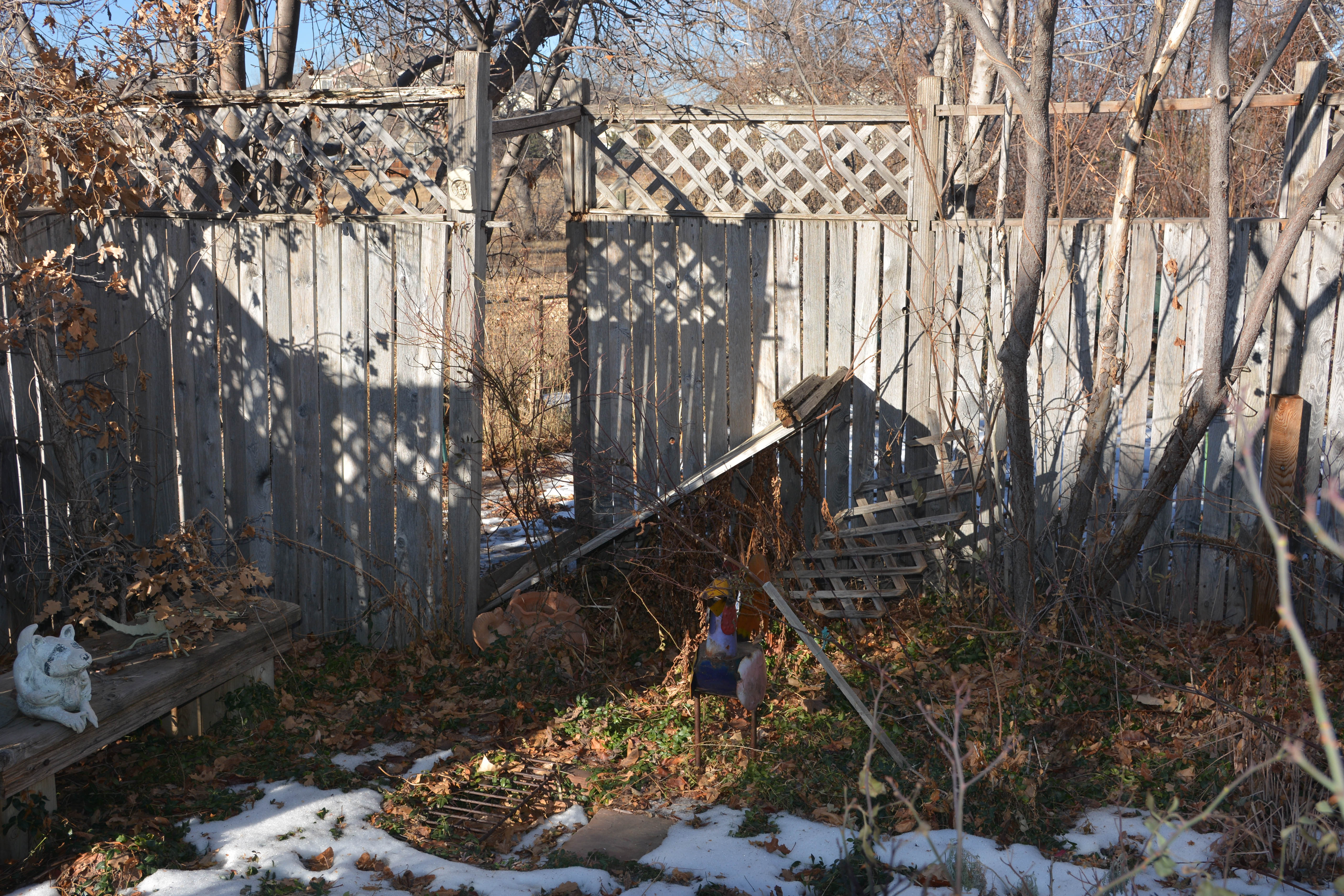 A part of the fence around “the enclosure” was blown down. More repairs to make. I guess the wood rots here, because this part of the garden is watered regularly. There was a yellow-jacket nest in the mouth of the big metal chicken this summer. The grate you see is for a fire pit, but that’s not used any more.