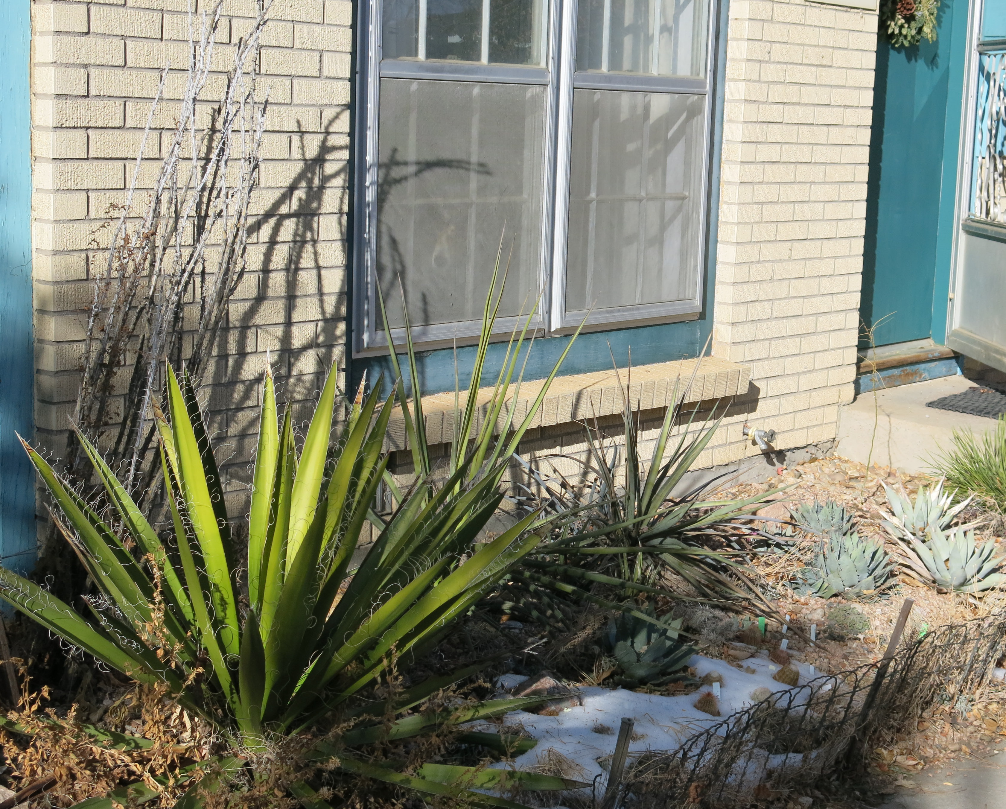 Is the Fouquiera splendens in the “cactus bed” by the front door alive (which can be hard to discern, I know)? I enlarged the photo and it looks like there are dessicated leaves of recent vintage attached to some of the canes. How many winters has it/did it survive?