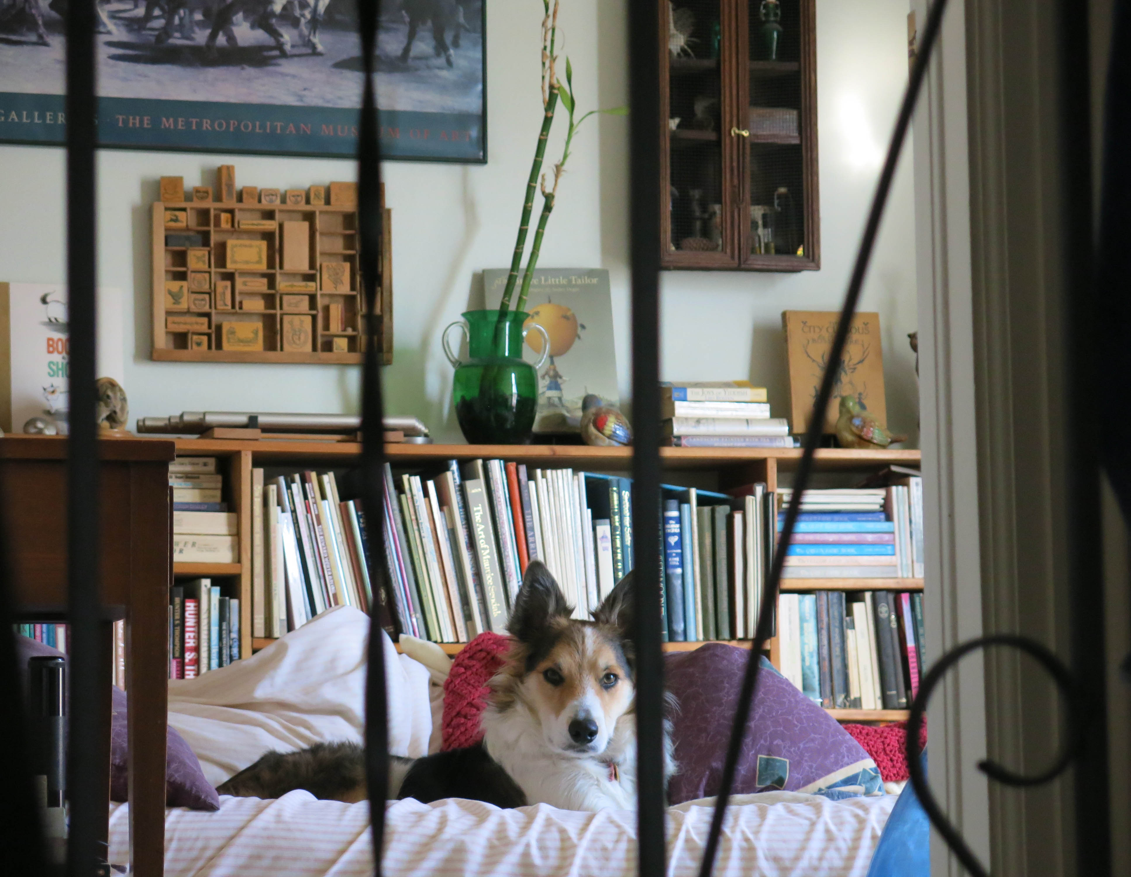 Thanks. The guy I live with was kind of obsessed with me, today, because of the large amount of blood that was on the kitchen floor, early this morning, but things turned out okay. He even called the emergency vet, for advice. The books in the bookshelves mostly belonged to the lady of the house (who built the bookshelves); all the décor there was hers, the rubber stamps, the gamelan, everything, except for “Boot & Shoe”, which the guy I live with put there because he thought it belonged. Originally it was, like, a spare bedroom, but eventually the guy I live with started sleeping up there, because the window faces east, which is completely excellent, and it’s become my favorite place to be, except for tonight, because of firecrackers, so my kitchen fort is the best place to be, right now.