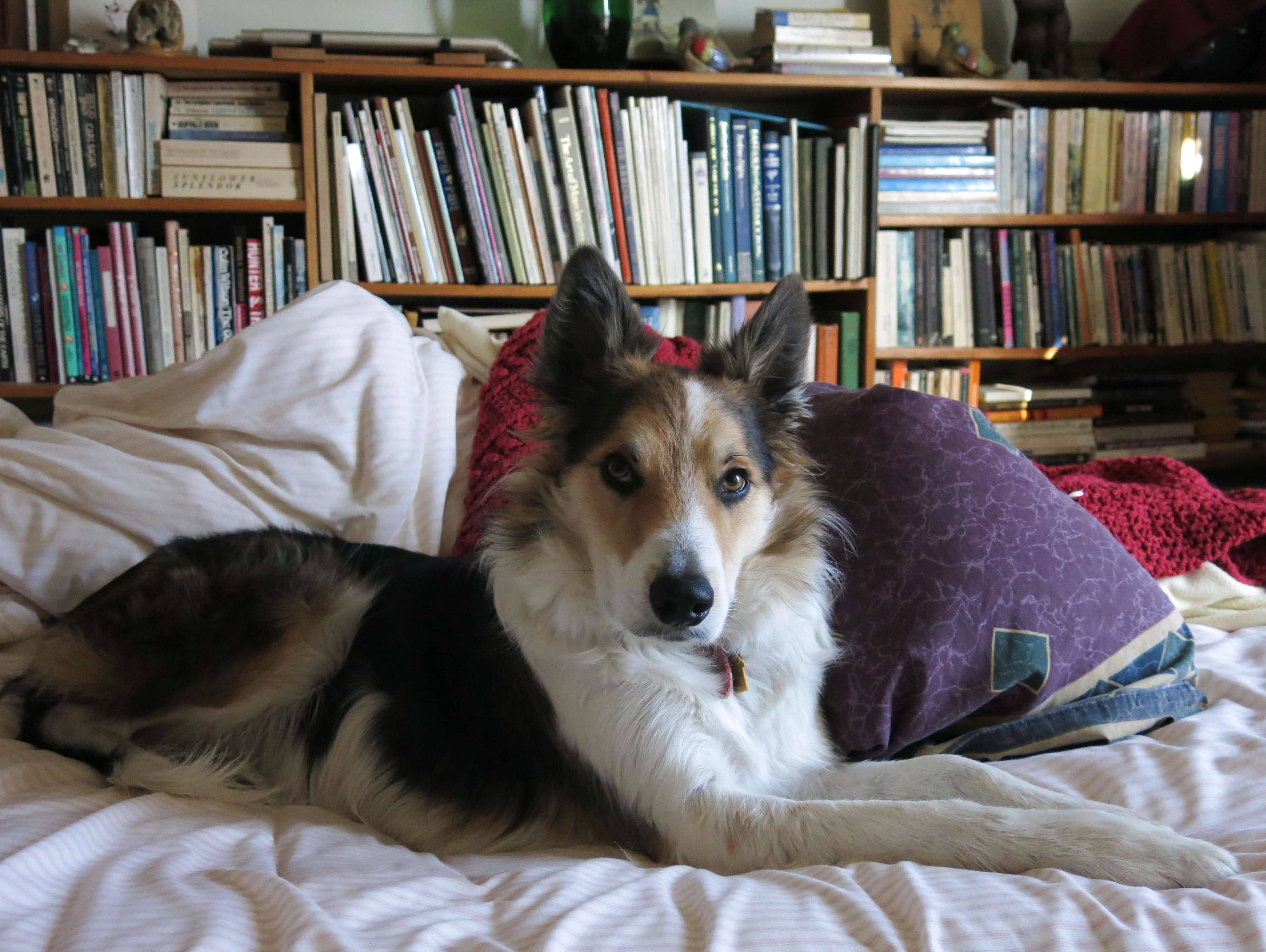 This is me doing a bit of convalescing, since early this morning I broke a toenail and bled all over the place. The guy I live with wasn’t sure what to do, because he wasn’t completely awake, and had forgotten that Chess, the purebred border collie who lived here before me, bled all over the living room carpet when the guy I live with tried to clip his toenails.