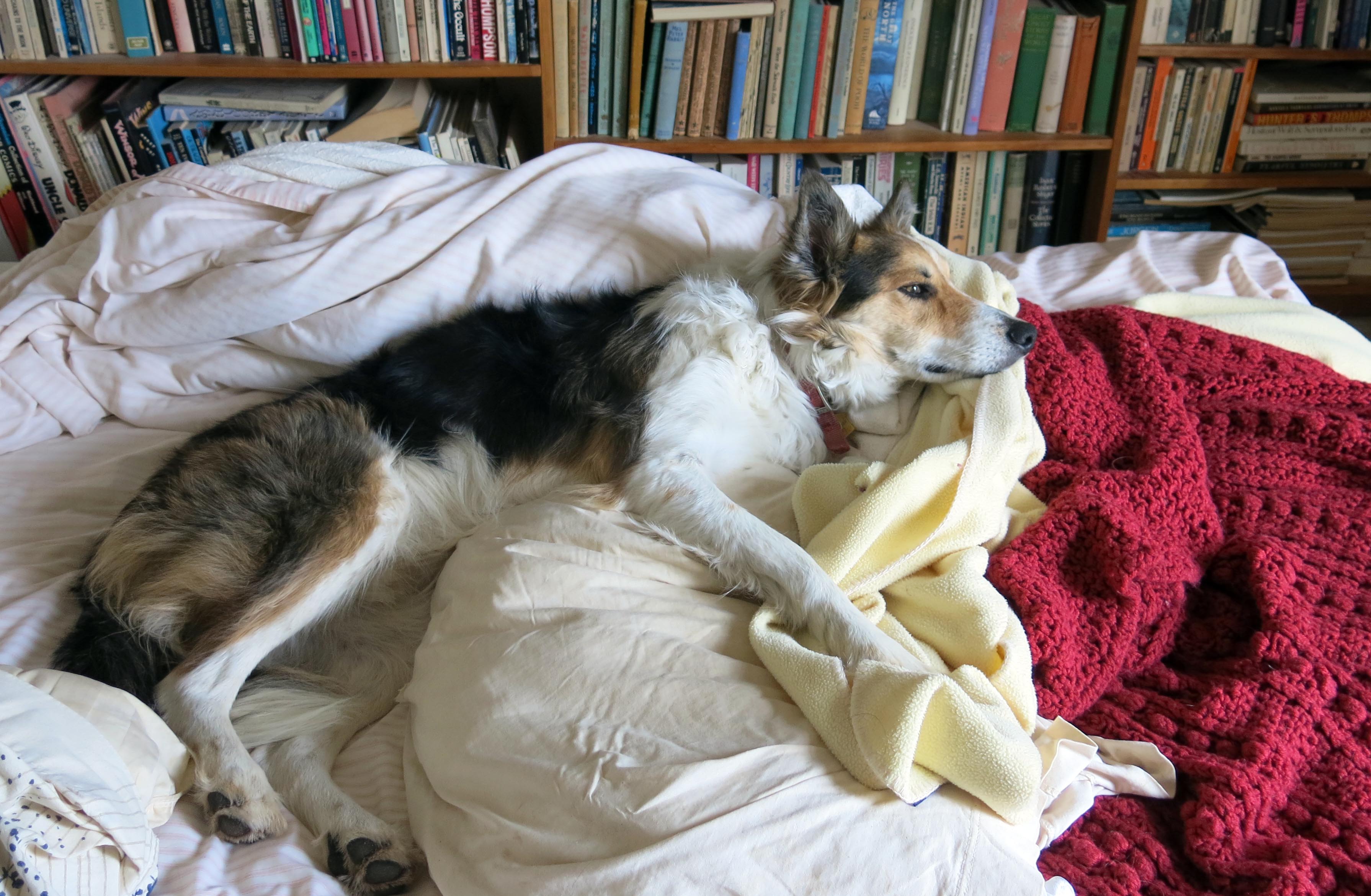 There was an “issue”, you might say, with one of the old down pillows on this bed. It kind of exploded, and there were feathers everywhere. It wasn’t my fault, of course. So in that picture I’m making sure that the other pillows don’t explode. The guy I live with said they weren’t down, which was weird, because they are up on the bed, but….well, as you can see, even purebred border collies can have a sense of humor.