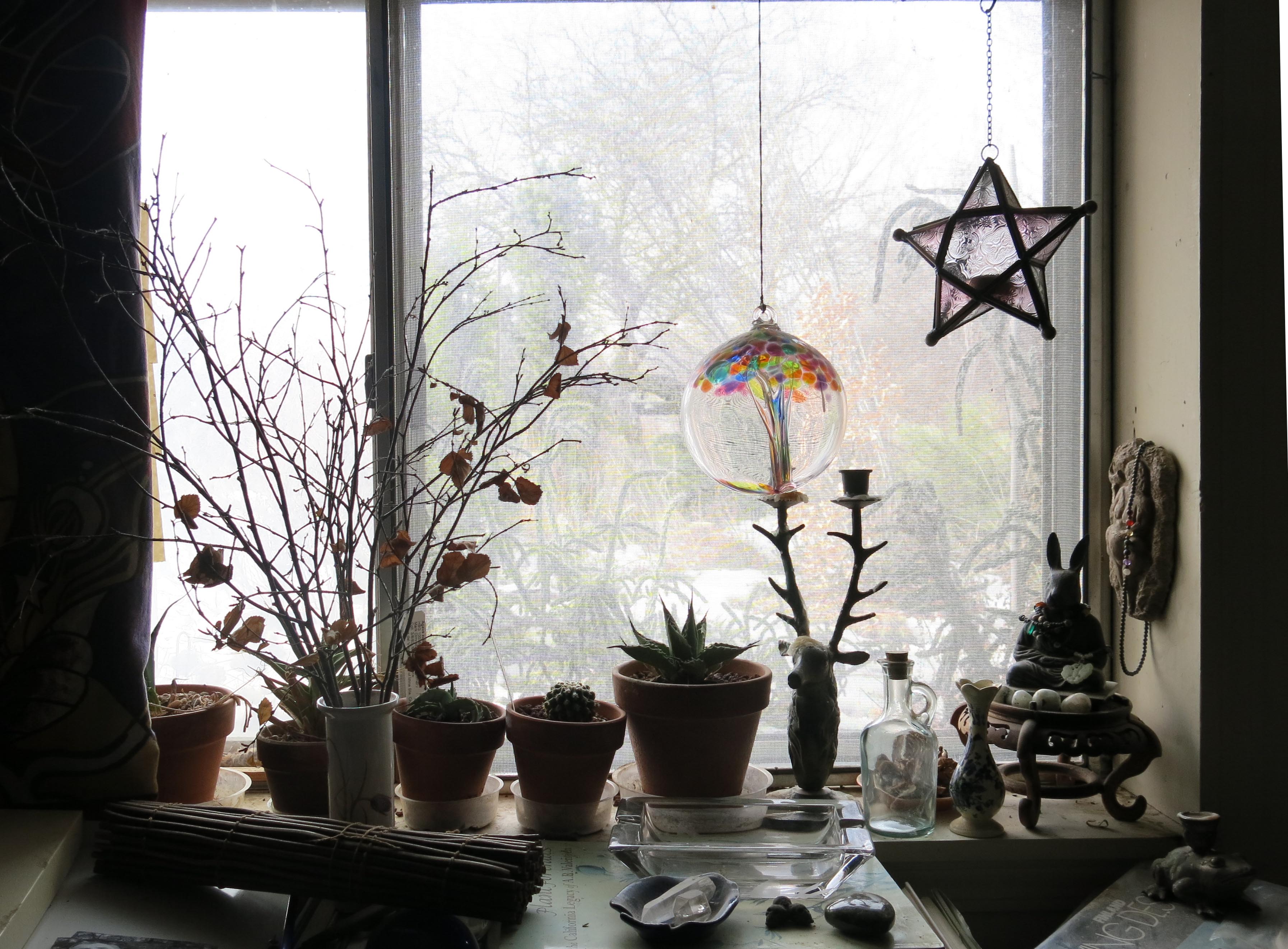 This is the view out of the window, looking west. Maybe I said earlier that the window was deliberately left dirty, to help filter the sunlight. If I didn’t, that’s why the window is dirty. The guy I live with made that arrangement of birch branches.