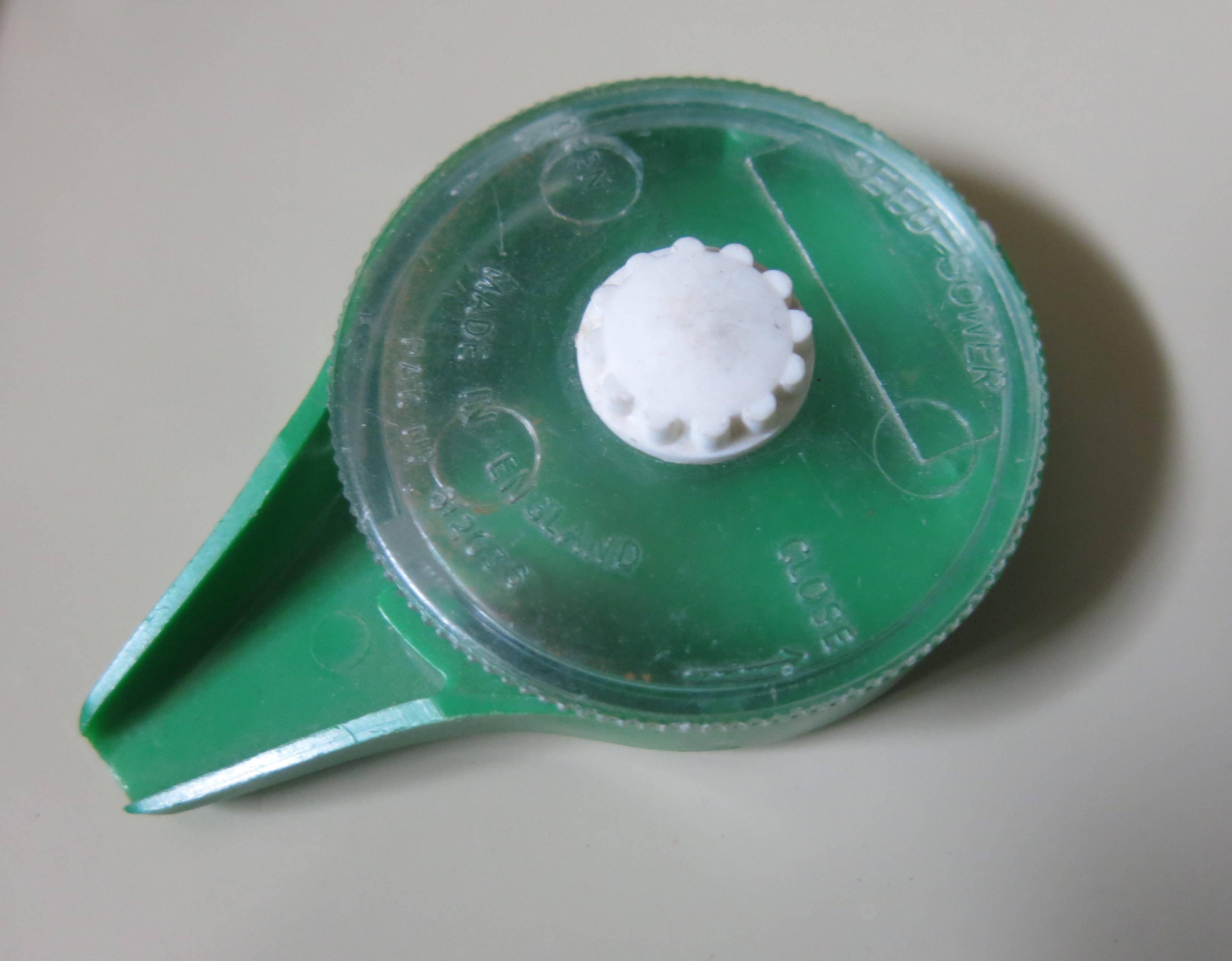 On top of the seed packets was this little plastic thing. It’s for sowing seeds; you put the seeds in the top by unscrewing it, and then the top rotates so you can control the number of seeds that are dispensed.