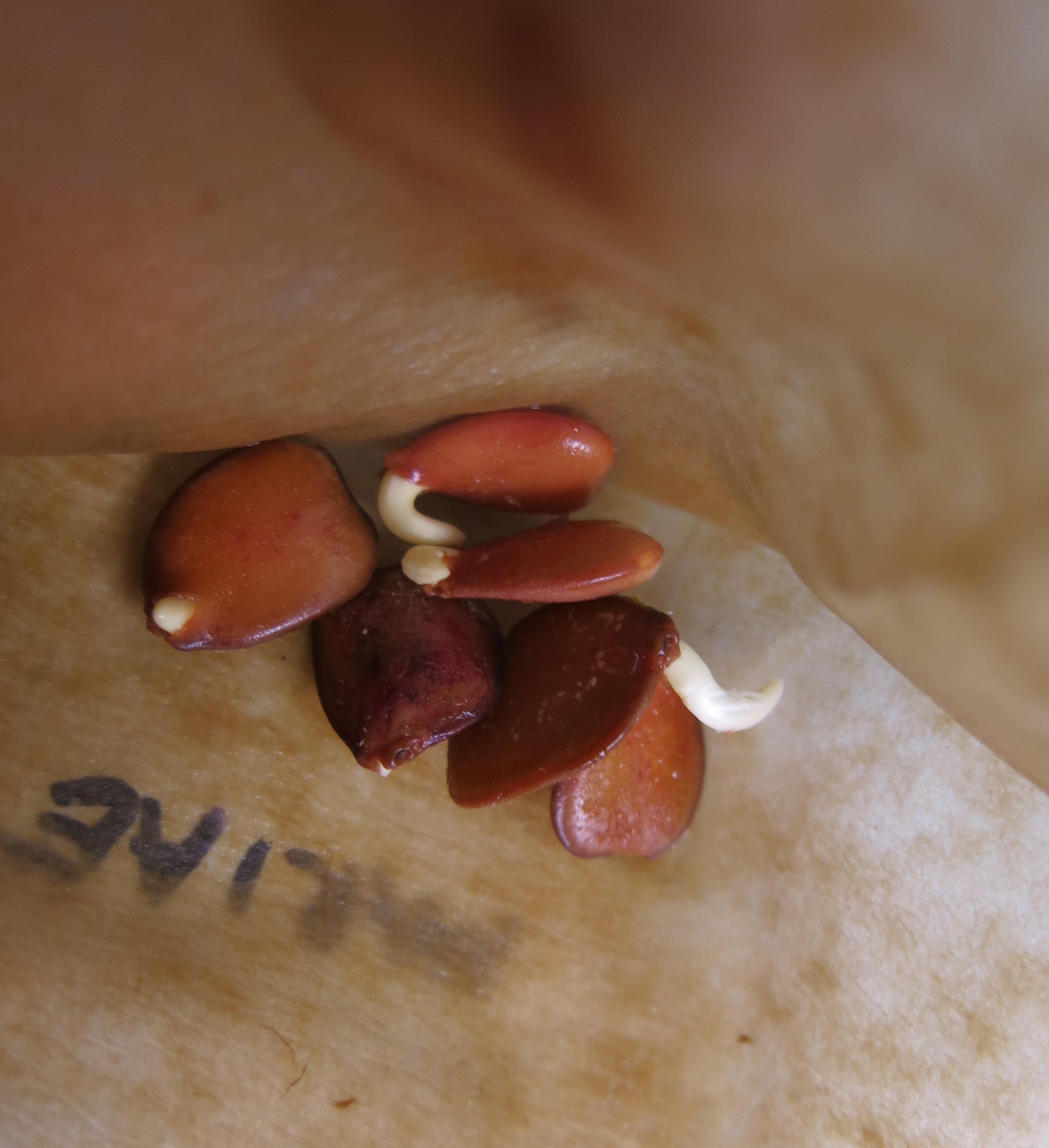 Being a member of the pea family, there are a couple of things about it. One is that container-grown plants are often very difficult to get established because the roots are growing around and around in the pot. That’s why, he says, people have a hard time getting redbuds to grow here, even though they do grow here. The redbud that was planted here never made it, because of that. So these will be potted in deep pots, for the roots to go down, instead of around. The other thing is that it’s a pea, so naturally the guy I live with nicked the edges of all the seeds, put them in a dish of hot water, and then put the seeds into a wet coffee filter and then into a plastic bag, three nights ago. As an experiment.