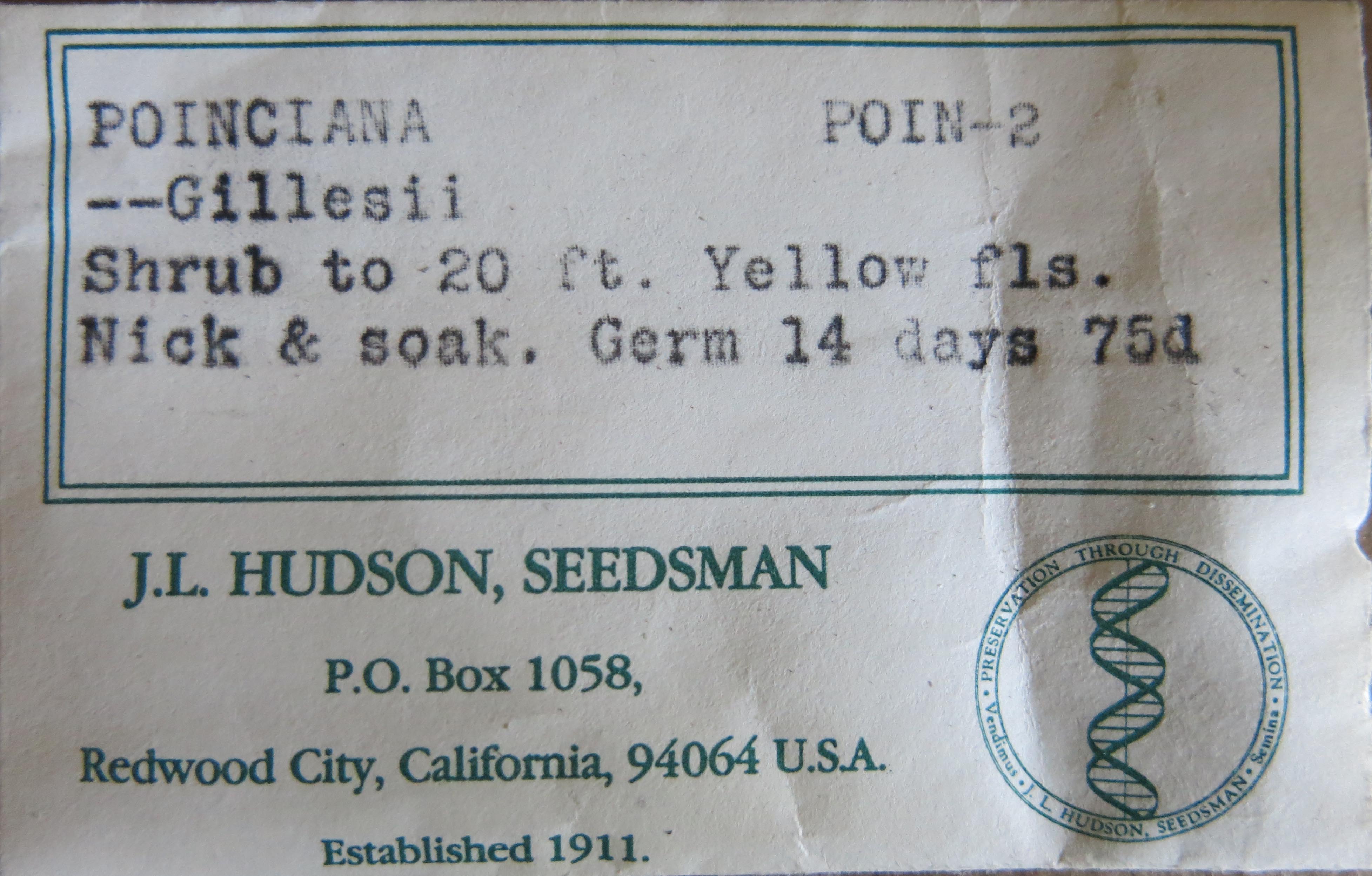 I didn’t know that seeds that old could still be viable, but they can. It depends on what. Like, members of the pea family, and others which have impermeable seed coats can be viable for decades. This is one of the packets. I hear that we call this Caesalpinia gilliesii now. The “desert bird-of-paradise”, which comes from Argentina and Uruguay, not really in deserts, but it’s grown in gardens in Arizona, and also grown here.
