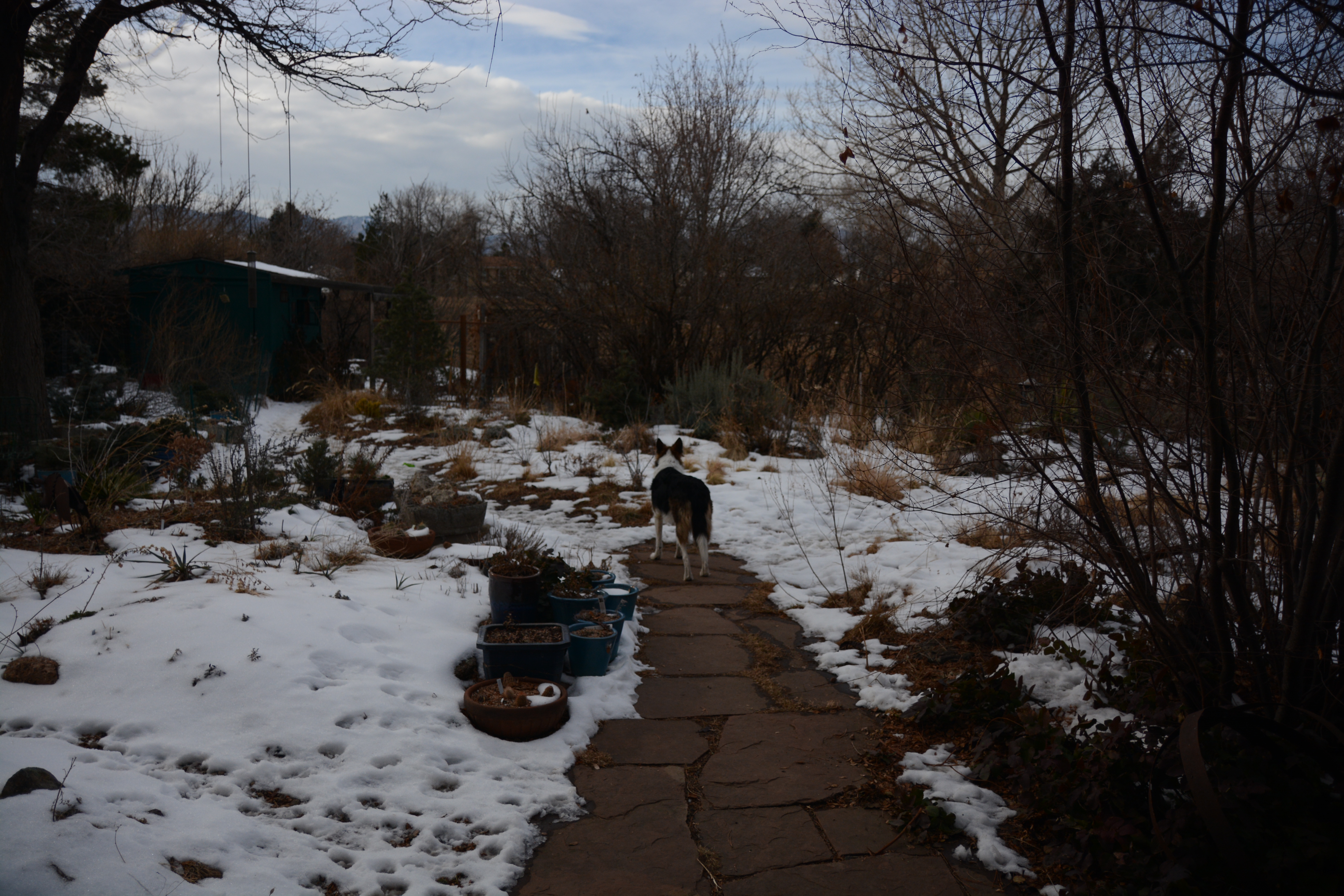 Down pillows give hostage to canine fortune, down pillows are an issue waiting to explode. Tell that to the guy you live with. He should understand, given that those seeds were just waiting (years) for his presence and careful – not to say obsessive – attention to germinate. They too were hostages to fortune, awaiting the nick of a sharp razor and a dish of hot water. I agree the room looks spiffy in the new paint. One step at a time. Yesterday I took lots of steps, Mani, marching around, and I think you as a border collie would have enjoyed being along for the exercise. Quite a few dogs were in attendance, all of them well-behaved. The knit blanket would have been a perfect wrap around my shoulders on the walk, just the color. I love the light in the last shot, lovely low-winter-sun light enveloping a dog surveying his snowy domain.