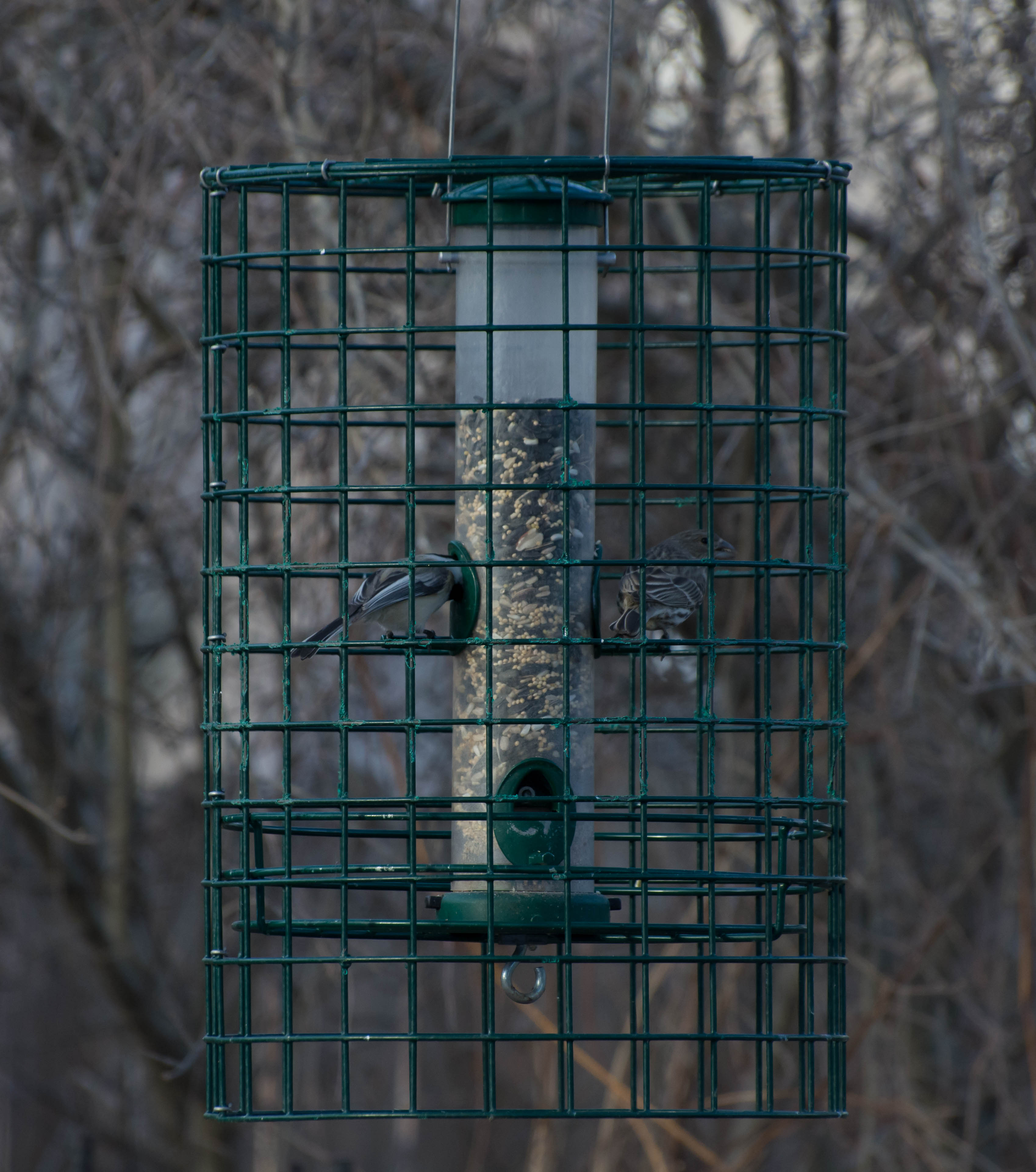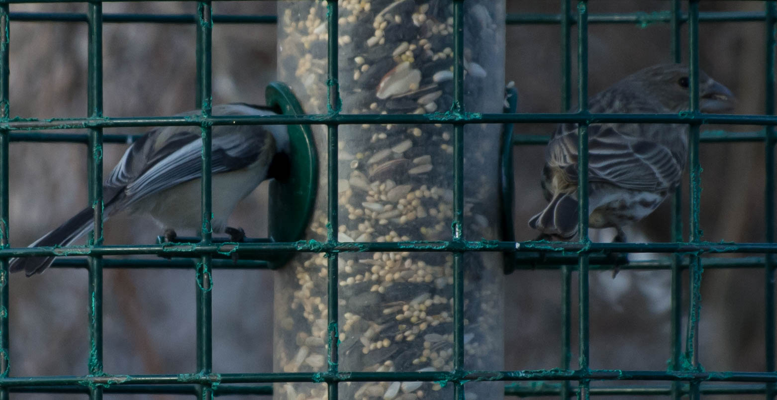 Today, even though it was chilly, the guy I live with spent some time trying to get macro pictures of birds. This was with a new lens he got. He finally figured out how to change the shutter speed on the camera, but hasn’t yet figured out how to focus on the birds in the squirrel-proof bird feeder rather than the cage itself. Depth of field or something. But at least he figured out that one thing. “One step at a time”, is what he said.