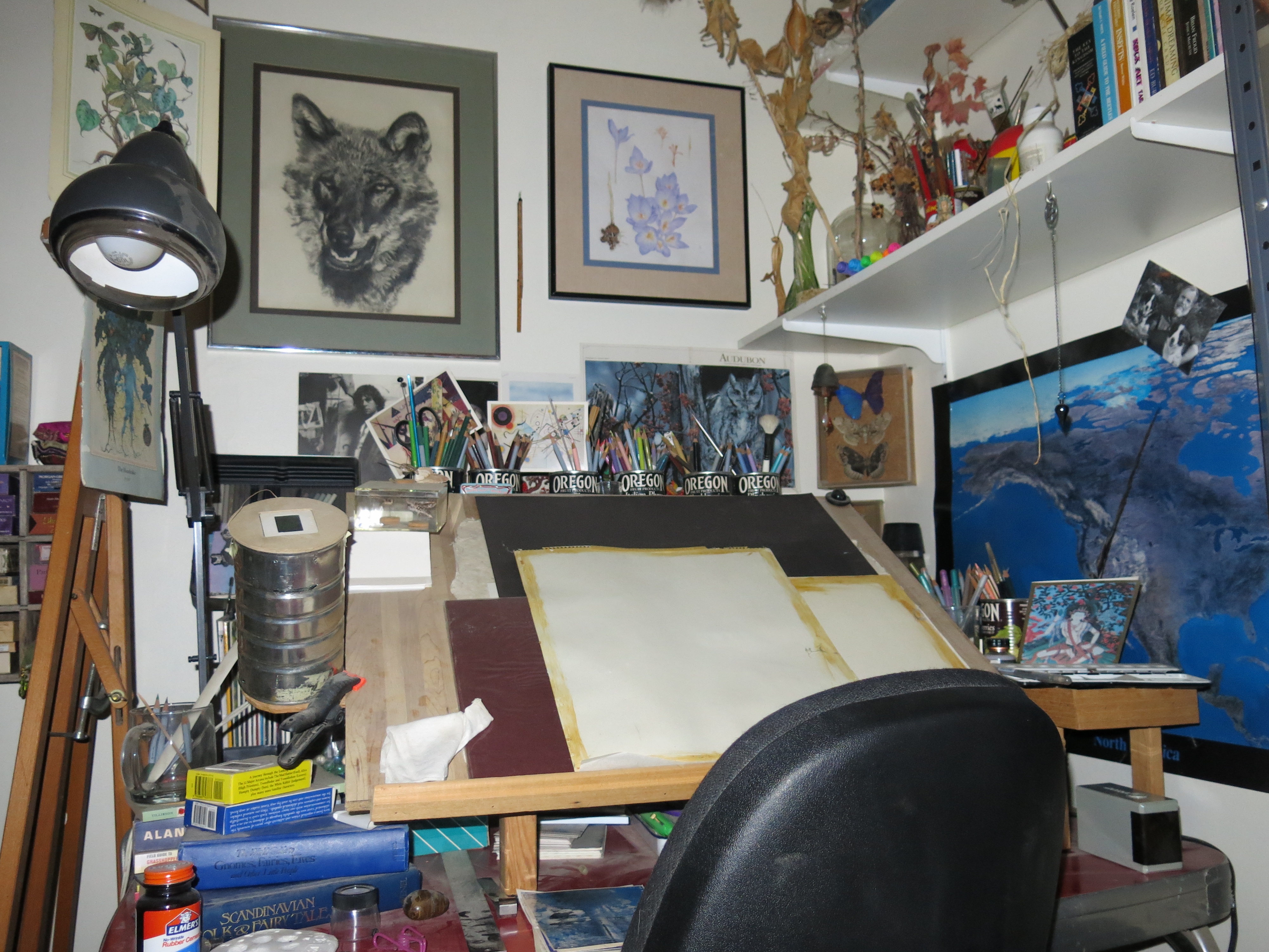 The project in the studio downstairs is almost finished. A few pictures which were tacked to the wall need to be framed, and then that will be it. Some things were thrown away; everything else was cleaned. He took pictures so everything could go back the way it was, because it would look better than if he re-did everything. There’s only one picture of the guy I live with above the picture of North America on the right, with Slipper and Chess, because he didn’t put up all the pictures. He says bunches of pictures of him would look weird. The empty part of the wall to the left of the wolf is where the framed pictures will go. They’re on the drawing table right now.