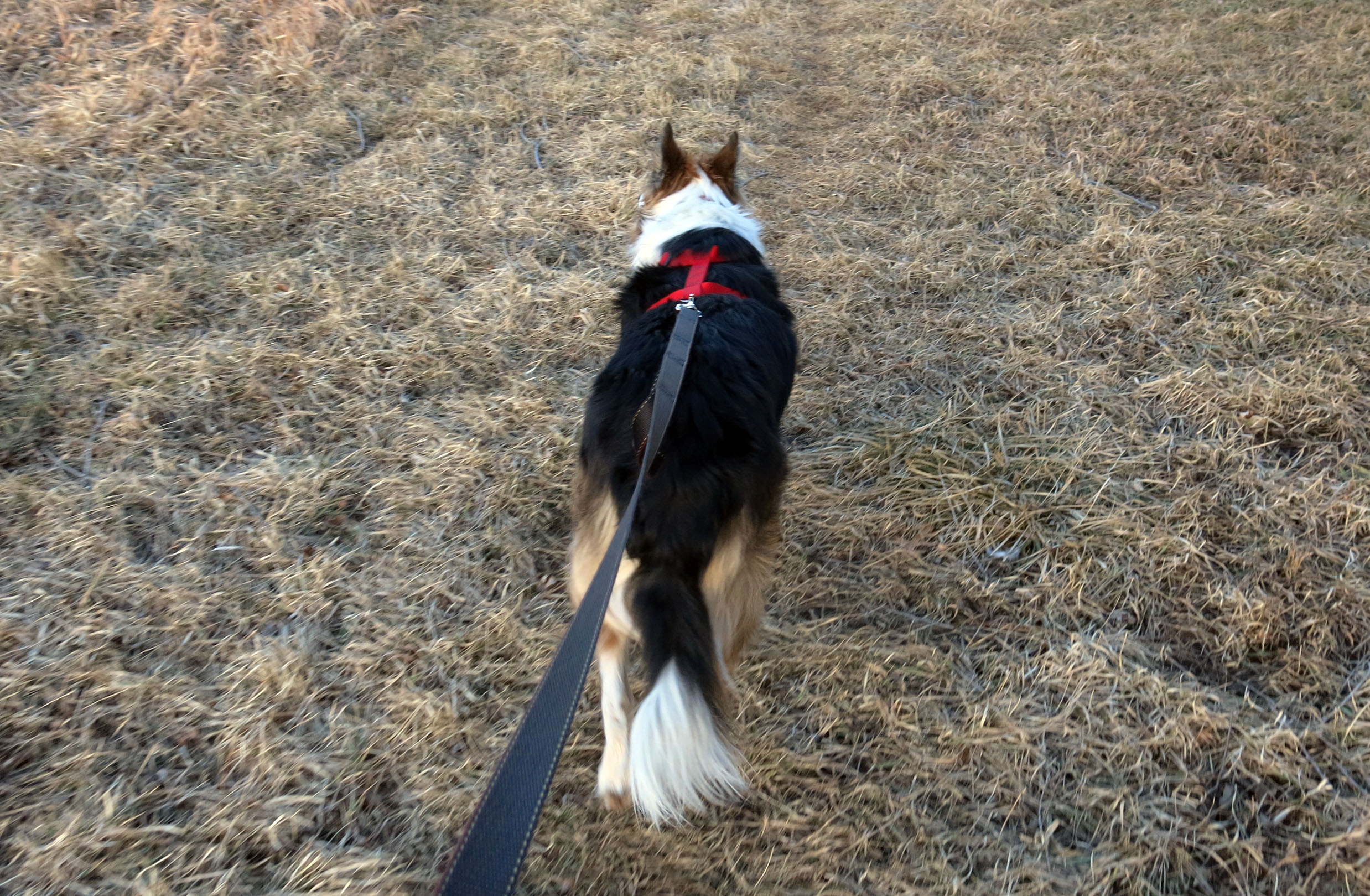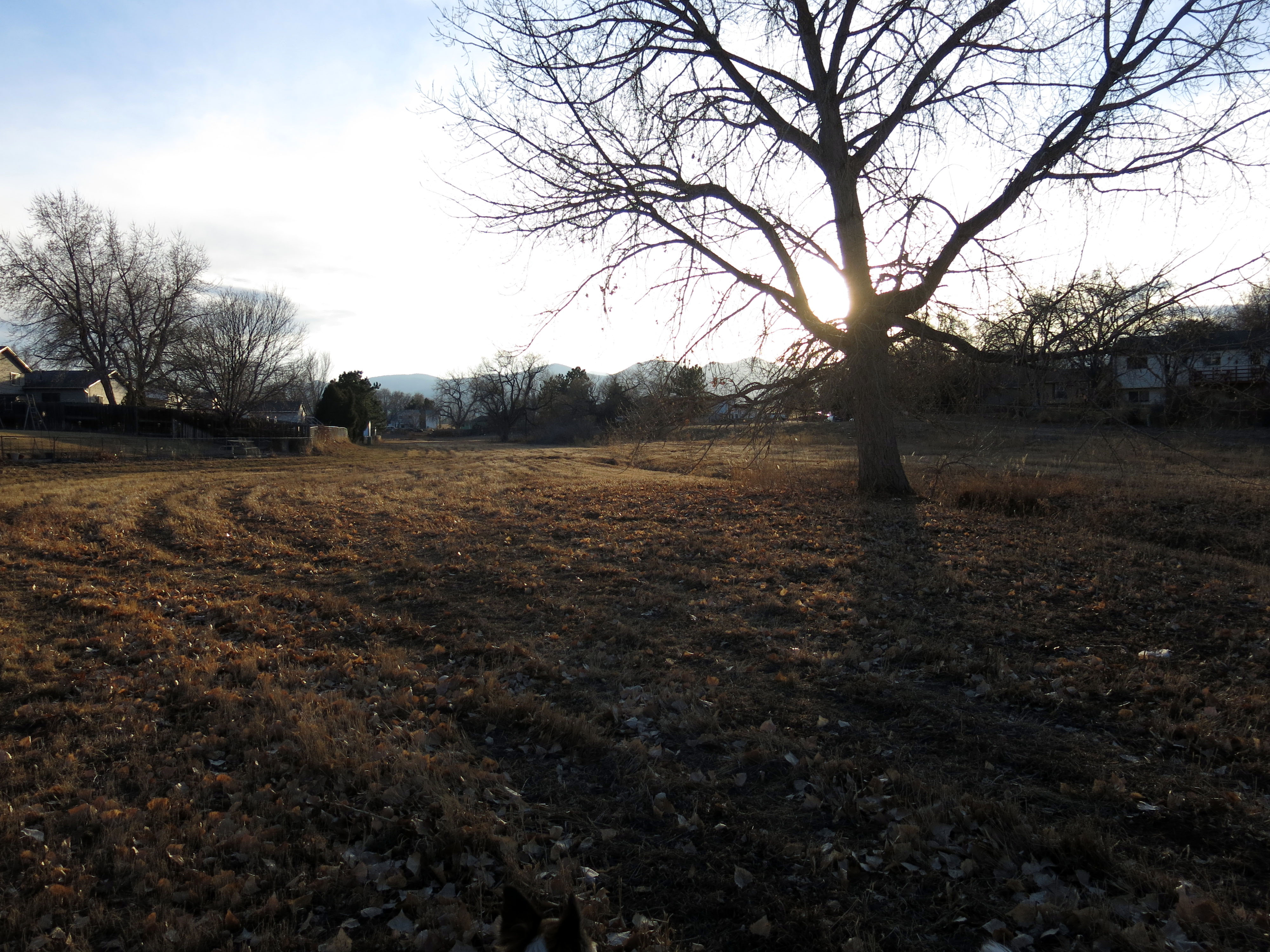 This is the field, looking southwest, late this afternoon. We walk along the trail made by Norm and Celeste, the coyotes, on the afternoon walk. The trail curves around by the fences, on the left.