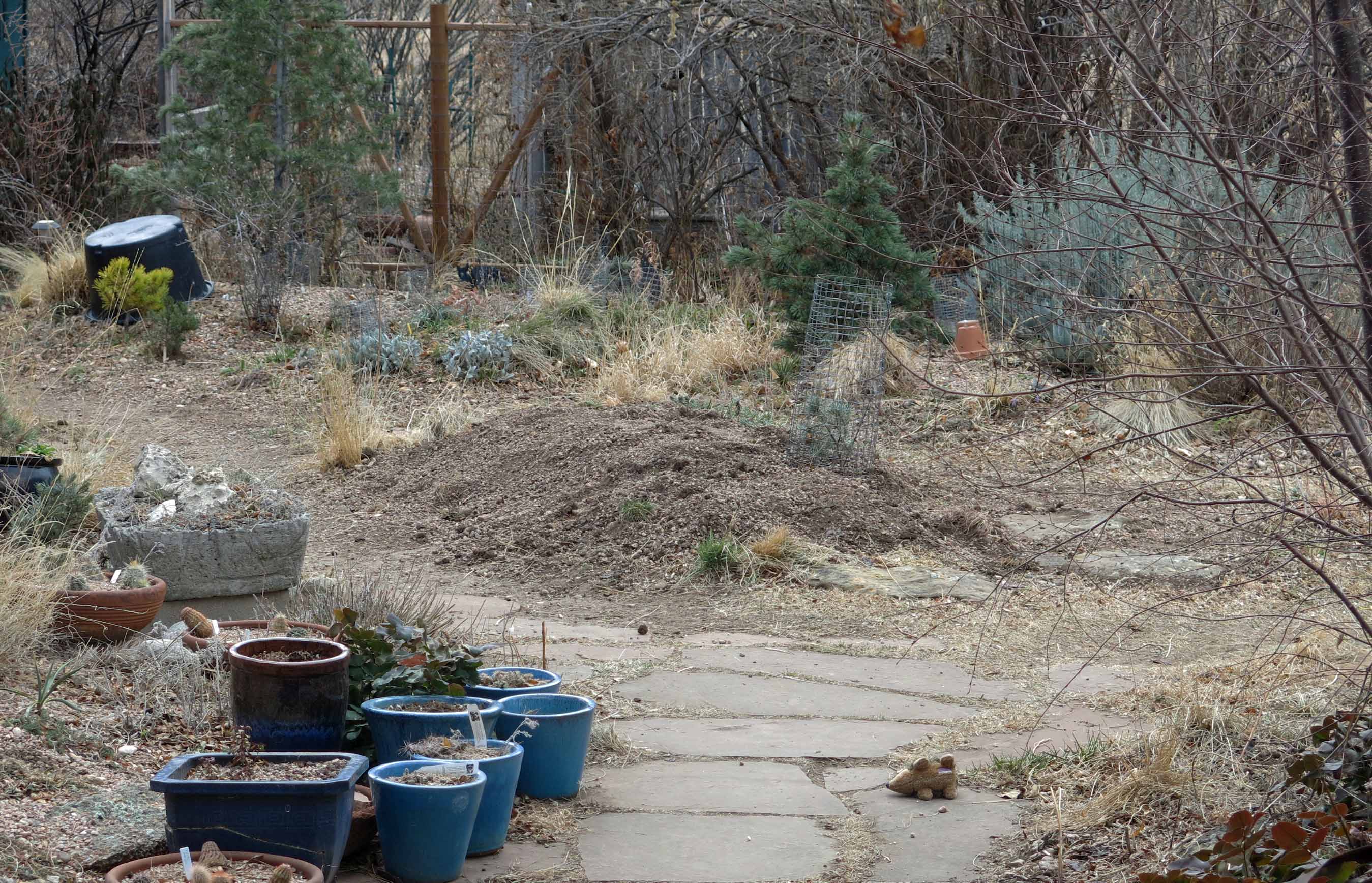The black tub is a liner for a half-whiskey barrel (half a barrel that used to hold whiskey, not half-whiskey), but we don’t have one of those here. There used to be half barrels in the garden, but they weren’t here when I showed up. Except for the one at the end of the patio, which never has anything planted in it. Someone talked him into taking the tubs and he’s been stuck with them ever since, but they are useful for covering bulbs on freezing nights.