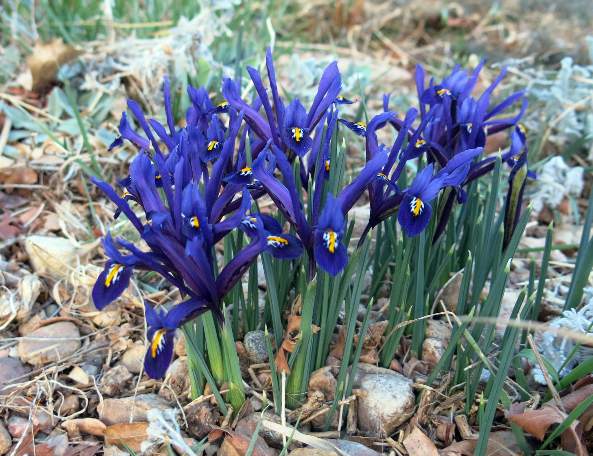 A few things are flowering, despite the cold nights and the birds. (And whatever else is chomping on the plants). This is a “regular” form of Iris reticulata. The point-and-shoot makes the flowers look too blue; they’re really purpler.