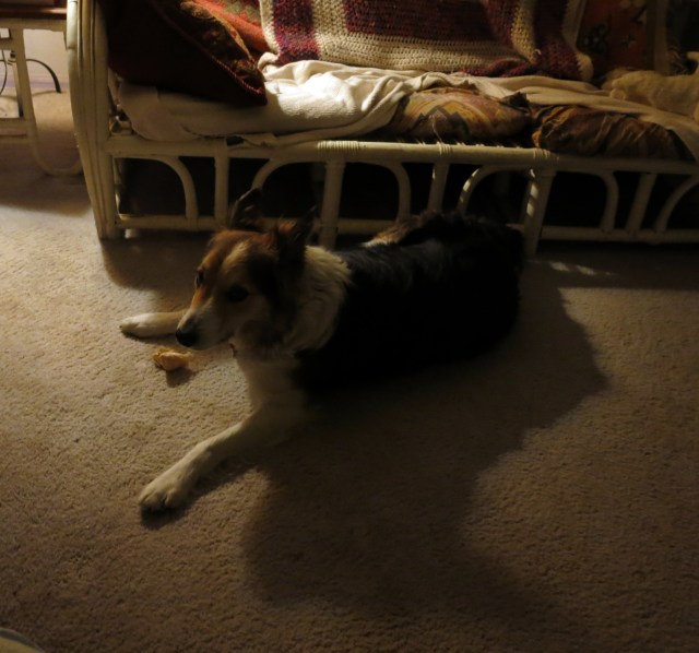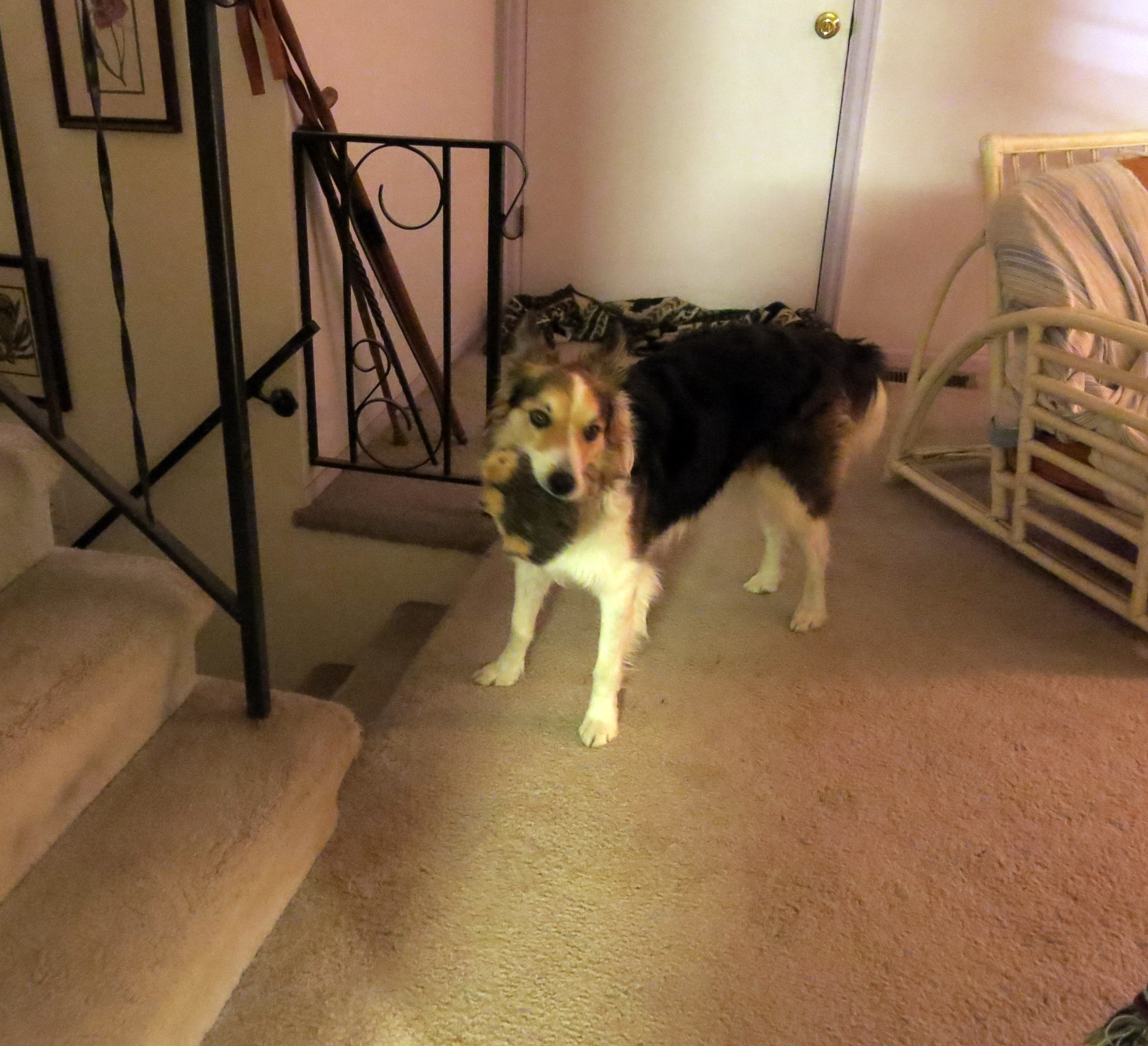 So that was my day. It was pretty good, all in all. After my cow ear, I got another biscuit, and then I got out one of my toys to celebrate.