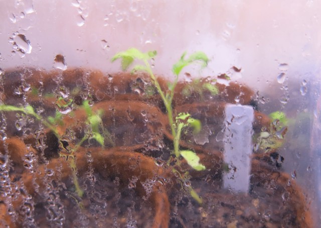 The tomato seedlings have perked up. The guy I live with said he made a mistake transplanting them into mushroom compost; he should have used his own, which is in a trash can out on the patio. He’s made his own seed compost, or “soil-less mix” now, for decades. I guess the seedlings will be transplanted again, because the stems of some of them are rotting.