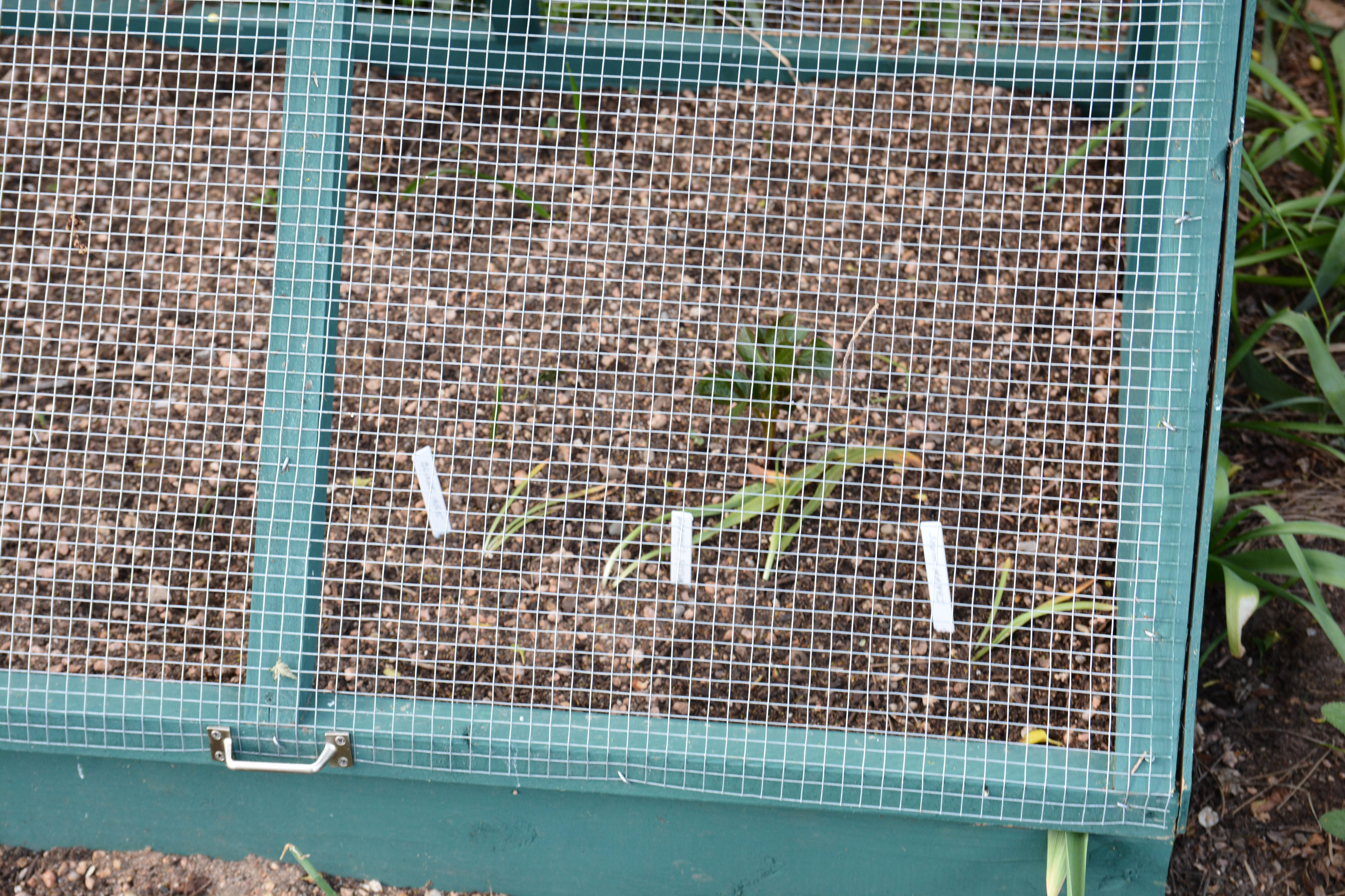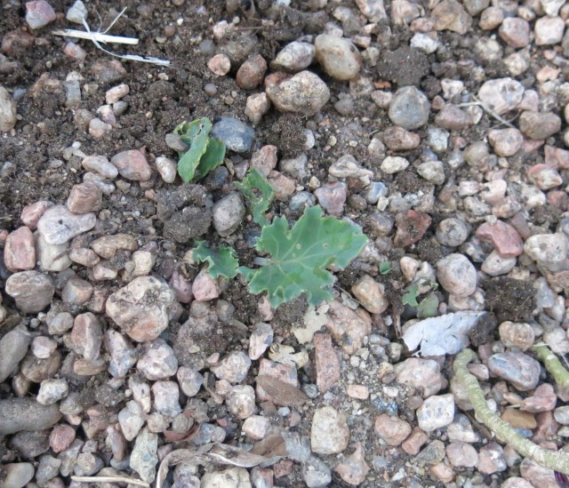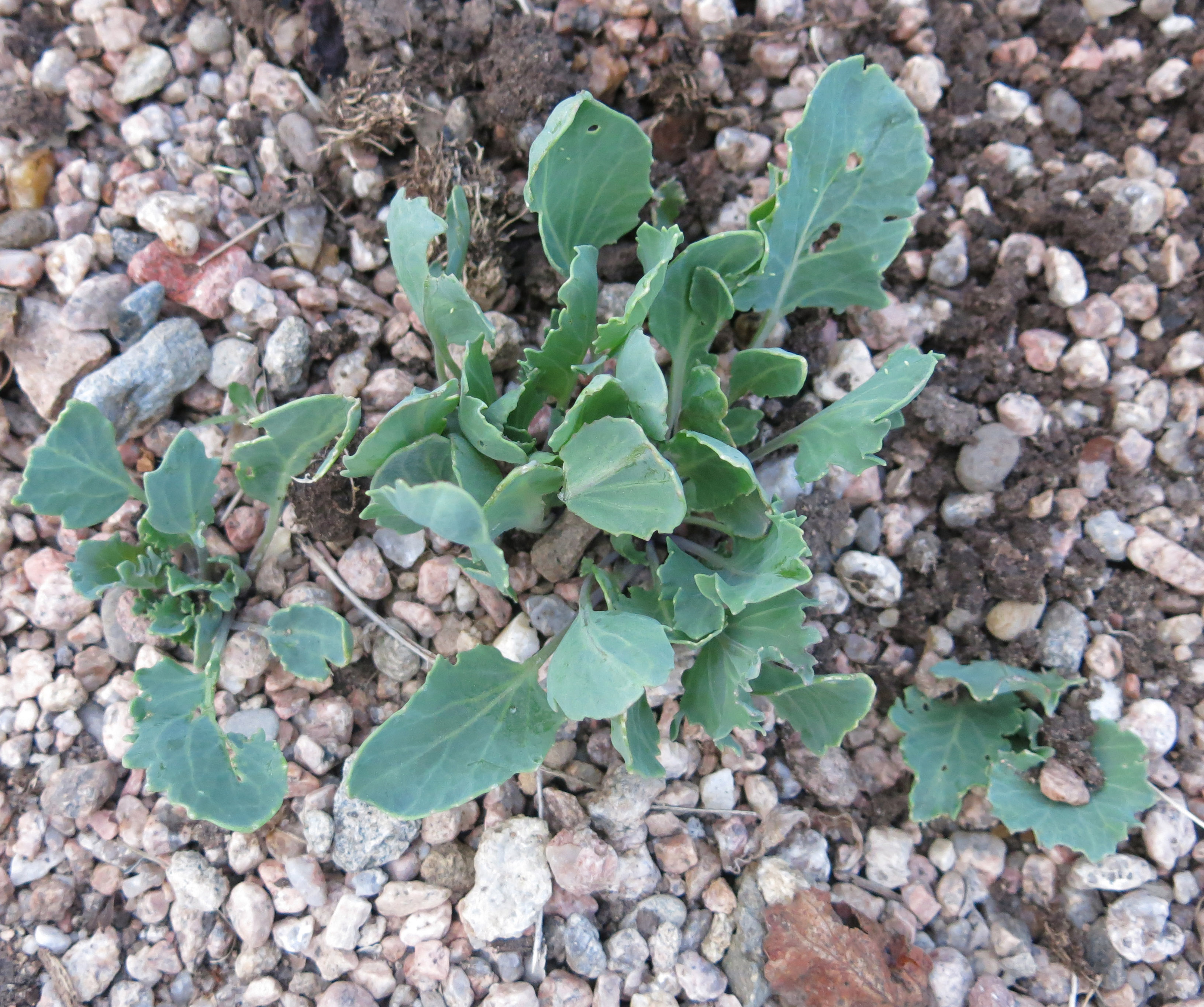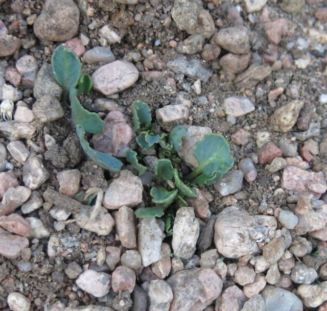 And then, something kind of funny happened. He had moved a big plant of the sea-kale, Crambe maritima, out to the border behind the enclosure, because he thought the plant might do better out there, rather than in the middle of the lawn. You may recall that when I was little I ate one of the plants. It was good. And then when the berm was re-made, there was a flat space, where the sea-kale was, and so it got moved. But look what he found in the same flat space, just today.