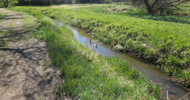 The water in the canal is flowing again, and there are ducks in it, as usual. I wanted to jump in the water and chase the ducks, but I think you know what the response to that was.