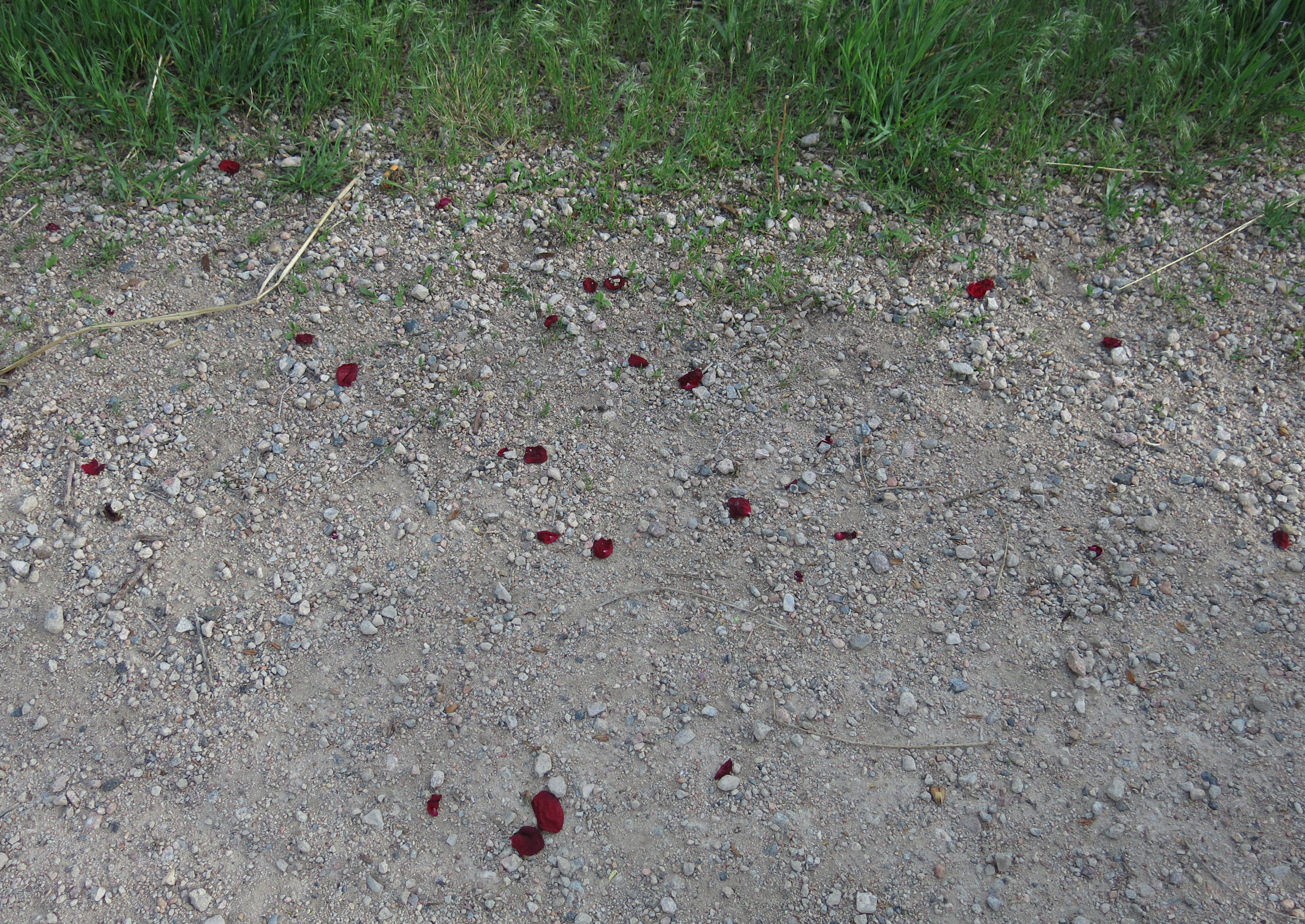 Those are red rose petals. There aren’t any red roses flowering around here, so something must have happened here. The guy I live with speculated a bit, like maybe there was a tryst, and then we kept on going.