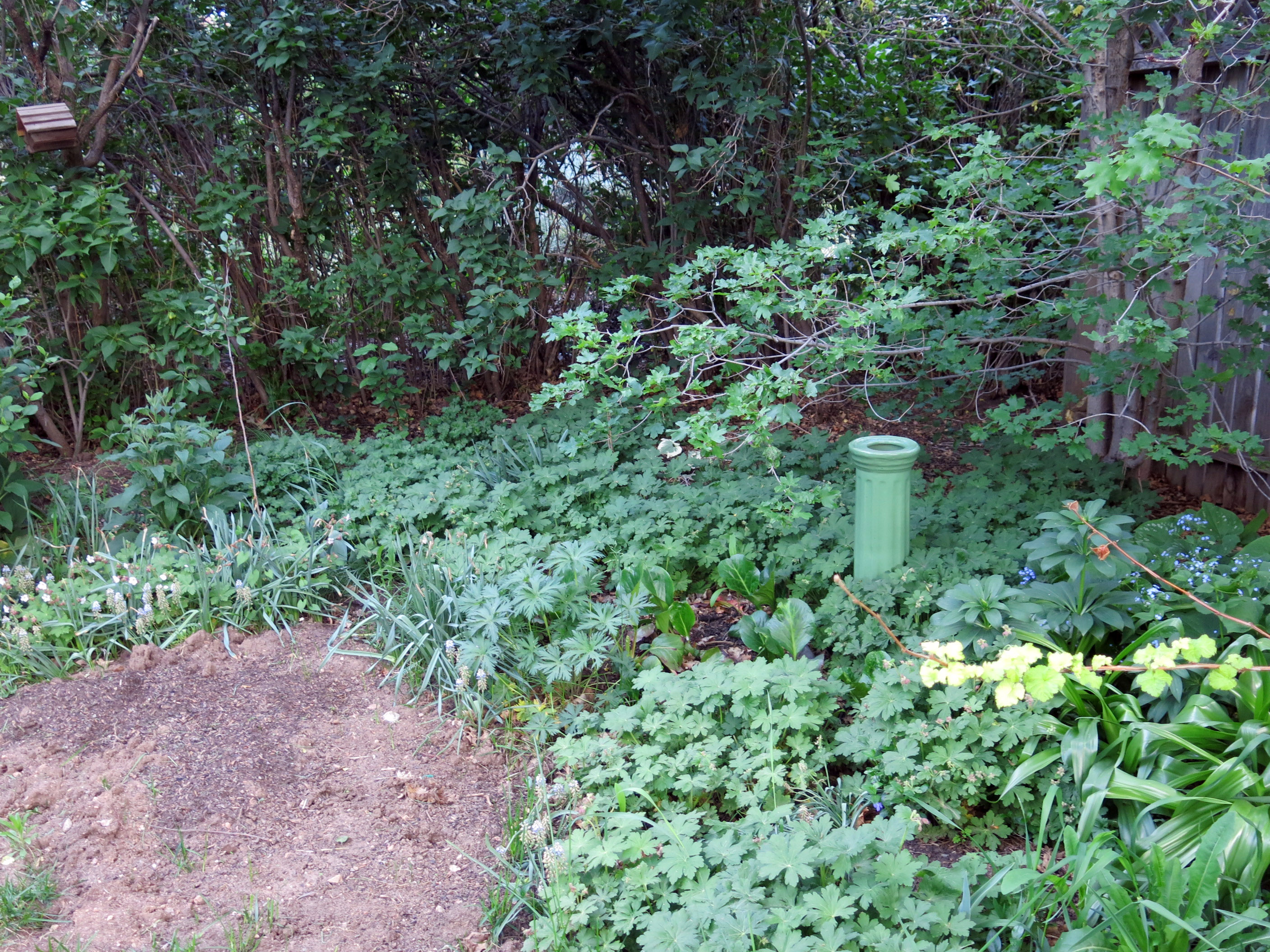 The “way back” shade garden is looking “okay” (what he said), though once again, like last year, part of it has been dug up. There’s some issue around changing the way the garden curves out in back, and I don’t really understand it, but basically he hasn’t found a way “not to wreck it”, so I guess every year this one area will be dug up, and look like this for the rest of the summer. I just don’t know. I guess it just has to have the curves that it does, and there needs to be some “inspiration”. That’s a whole lot of Geranium macrorrhizum there, by the way.