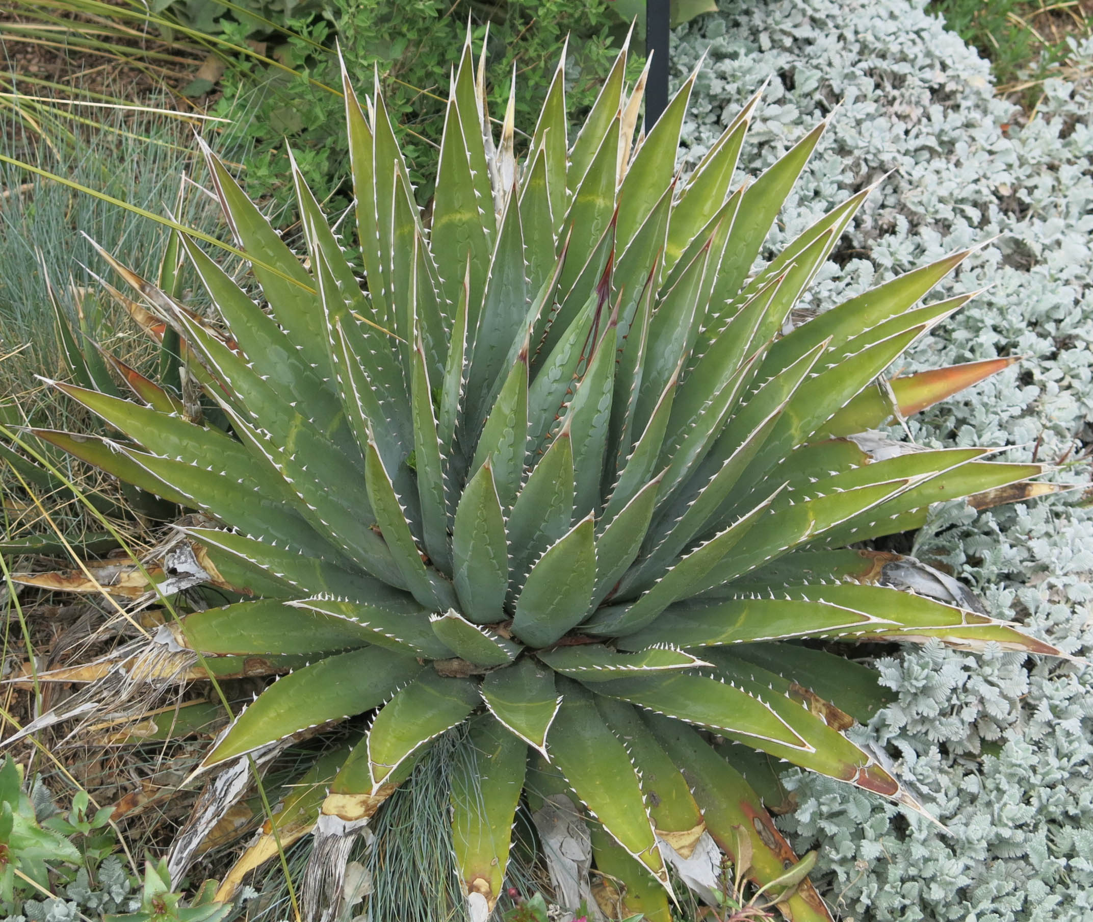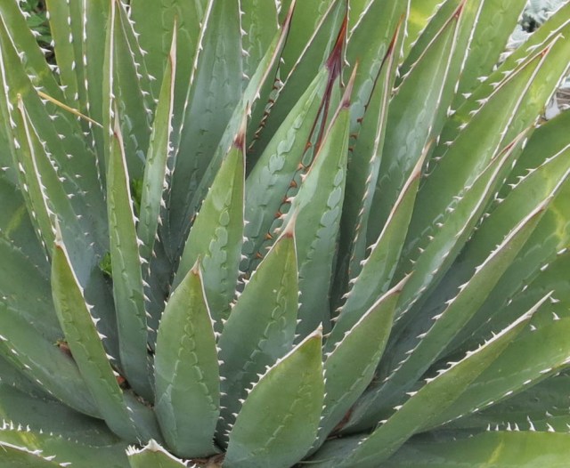 The Gardens had hail, the day that we did, though it was much worse there. It was like hearing that a good friend was really sick. The guy I live with loves the Gardens to distraction. The dwarf conifer garden was unscathed, and so was this (as he said) magnificent specimen of Agave utahensis.