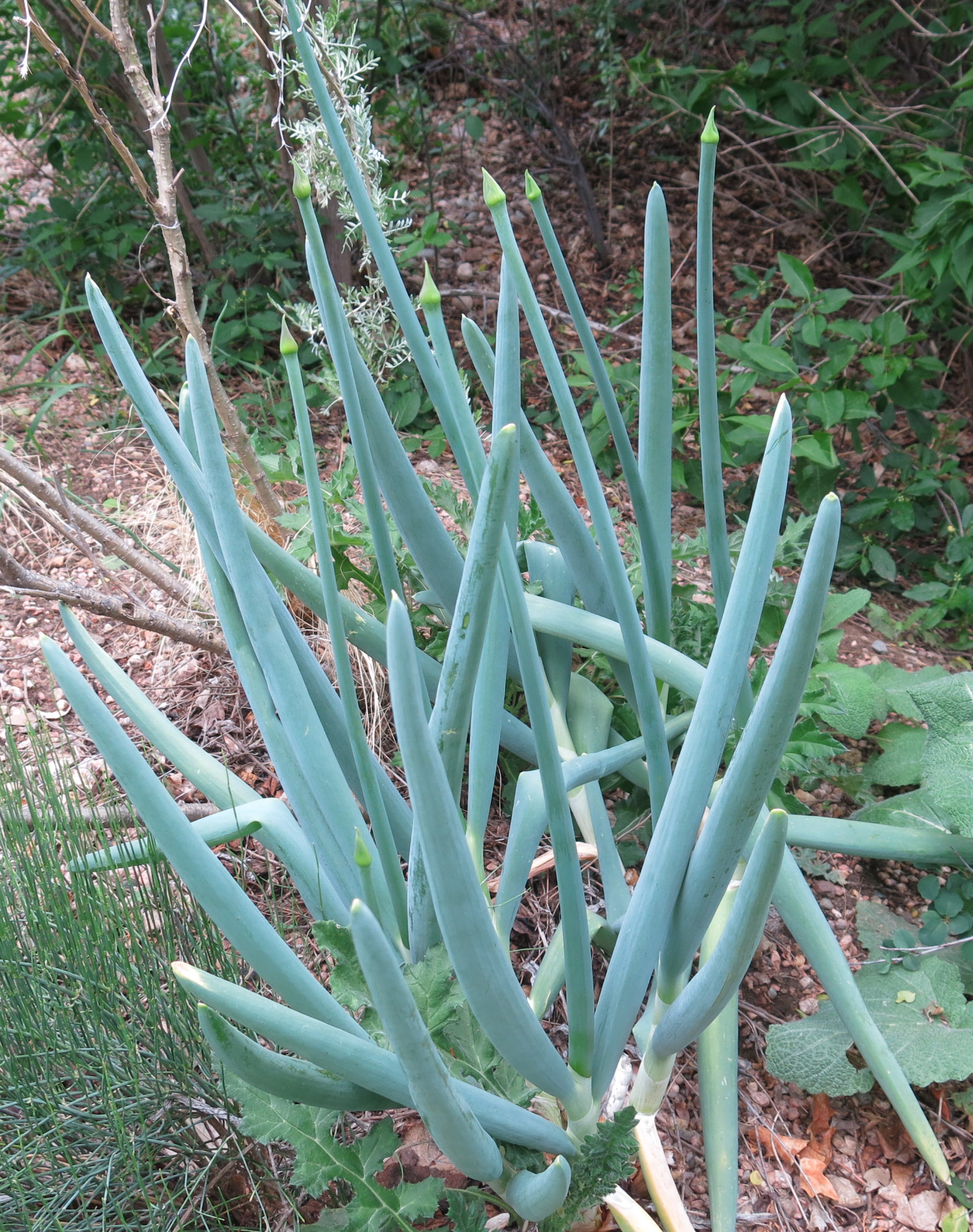 Allium pskemense is about to flower. The leaves are these weird-looking green tubes. The guy I live with says that it its native habitat, Uzbekistan, the plants, the bulbs really, are used in cooking. They are onions, after all.