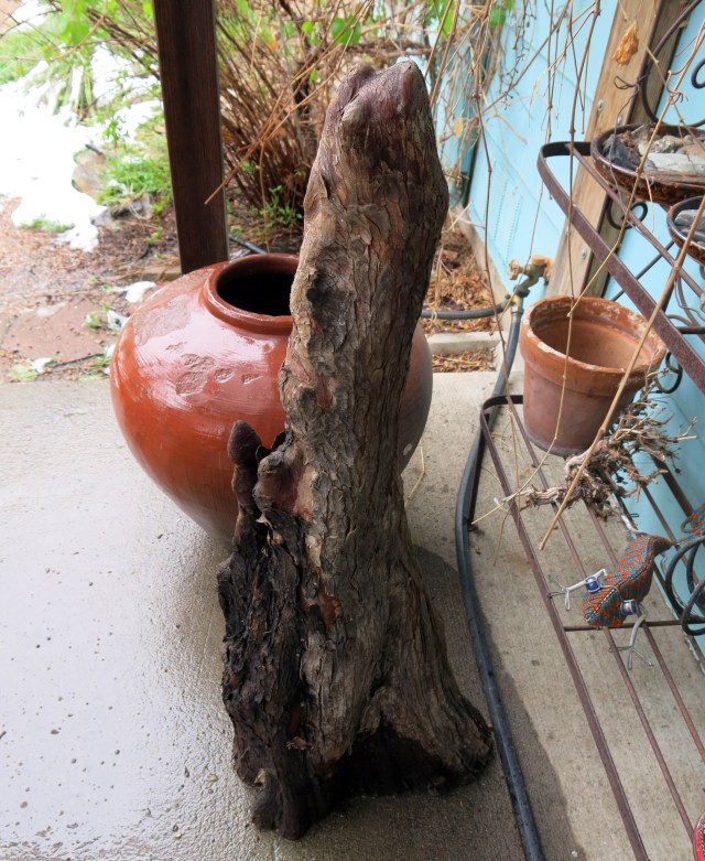 It turned out that not only was this a thing, it was a cypress knee. They form on the root systems, I guess, of bald cypresses (Taxodium distichum), and no one really knows for sure why they do. The people across the street were moving away, and they said he could take the knee, otherwise it would be thrown away. So now we have this cypress knee, and you might see it in pictures later, but you’ll know what it is. You might have known already.