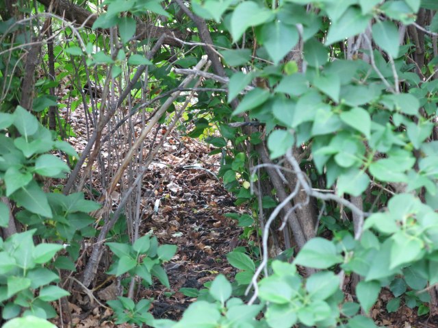 This is Slipper’s Shortcut. (I use it, too.) He made this when he and his buddy Chess played hide-and-seek in the garden, which they did a lot. Slipper would use this shortcut to sneak up on Chess. It was kind of cheating, but they both enjoyed it.