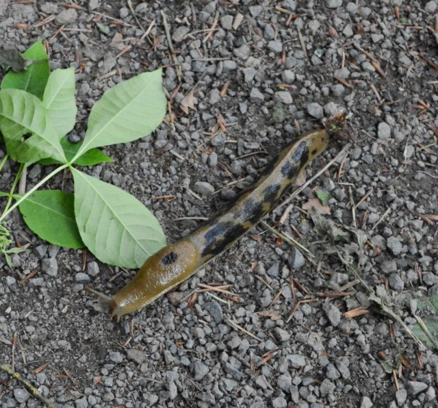 This is called a slug. The guy I live with said they move very slowly, but he watched it cross the gravel. He said it was like waiting for a traffic light to change, here. (In Portland the traffic lights change in a normal way, and that you don’t see your life pass before your eyes as you wait for the light to change.) He also said that I might like to catch something like this and try it, the way I like to do, but that he would object to that.