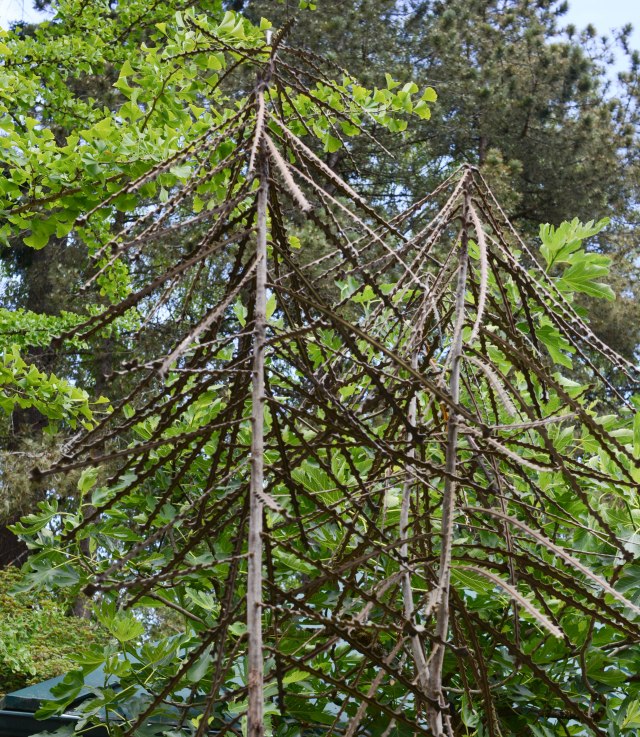 And then there was this frighteningly weird thing, Pseudopanax ferox. The focus isn’t on it, actually, but on the green leaves behind it, but I think you get the idea.